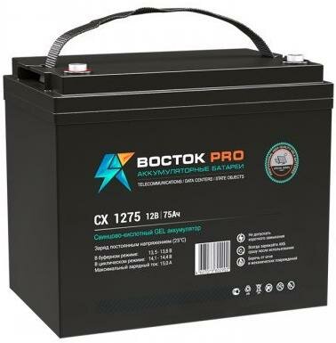 Аккумулятор Восток СХ-1275 (ёмкость 75 Ач; напряжение 12 В) благодаря технологии GEL (электролит загущен до состояния композитного геля) устойчив к глубоким разрядам и стабильно работает при переменных температурах. Срок службы составляет 10 лет или 1800 циклов в буферном и циклическом режимах соответственно.