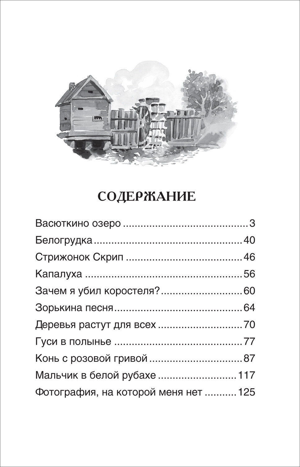 В сборник вошли рассказы В. П. Астафьева «Васюткино озеро», «Белогрудка», «Стрижонок Скрип», «Зорькина песня», «Гуси в полынье», «Конь с розовой гривой», «Фотография, на которой меня нет» и другие. Читателю предстоит погрузиться в полную трудностей повседневную жизнь послевоенной сибирской деревни, увидеть ее глазами ребенка — главного героя этих рассказов.