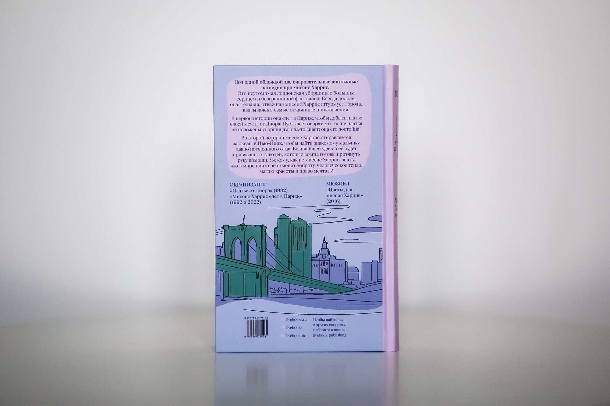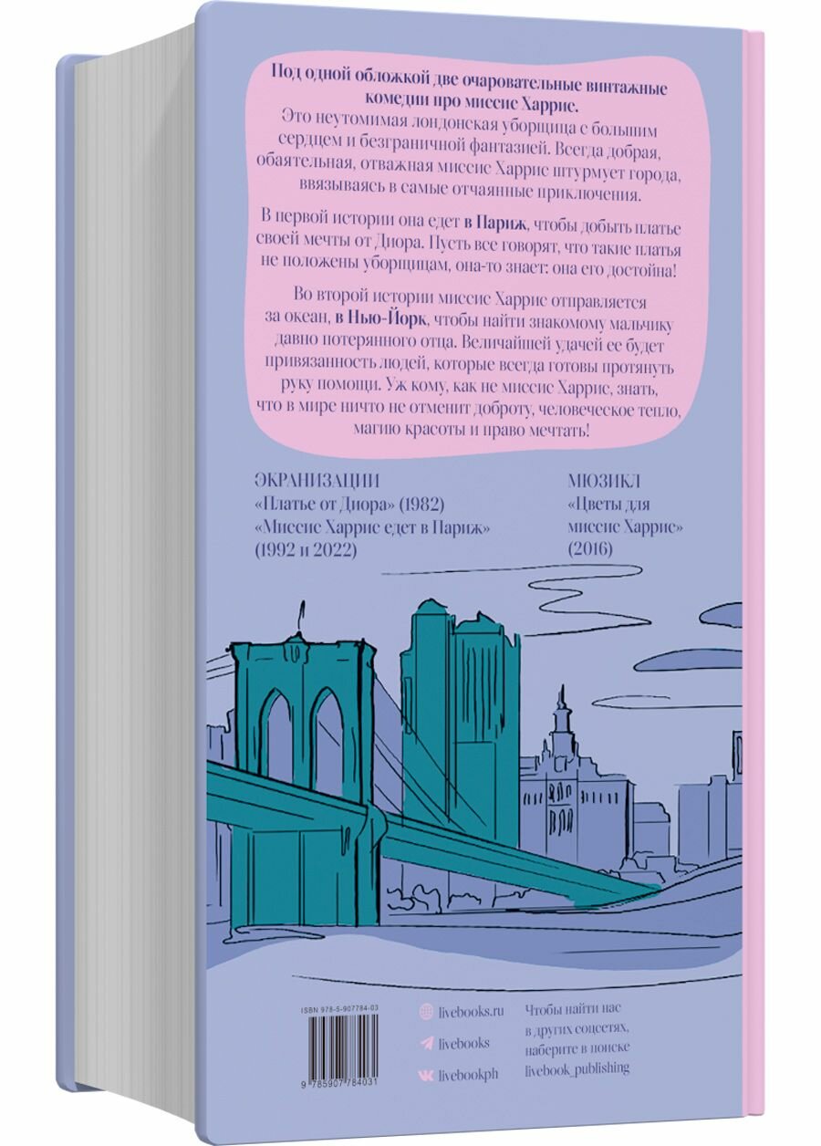 Под одной обложкой две очаровательных винтажных комедии про миссис Харрис. Это неутомимая лондонская уборщица с большим сердцем и безграничной фантазией. Всегда добрая, обаятельная, отважная миссис Харрис штурмует города, ввязываясь в самые отчаянные приключения. В первой истории она едет в Париж, чтобы добыть платье своей мечты от Диора. Пусть все говорят, что такие платья не положены уборщицам, она-то знает: она его достойна! Во второй истории миссис Харрис отправляется за океан, в Нью-Йорк, чтобы найти мальчику-сироте давно потерянного отца. Величайшей удачей ее будет привязанность людей, которые всегда готовы протянуть ей руку помощи. Уж кому, как не миссис Харрис знать, что в мире ничто не отменит доброту, человеческое тепло, магию красоты и право мечтать!