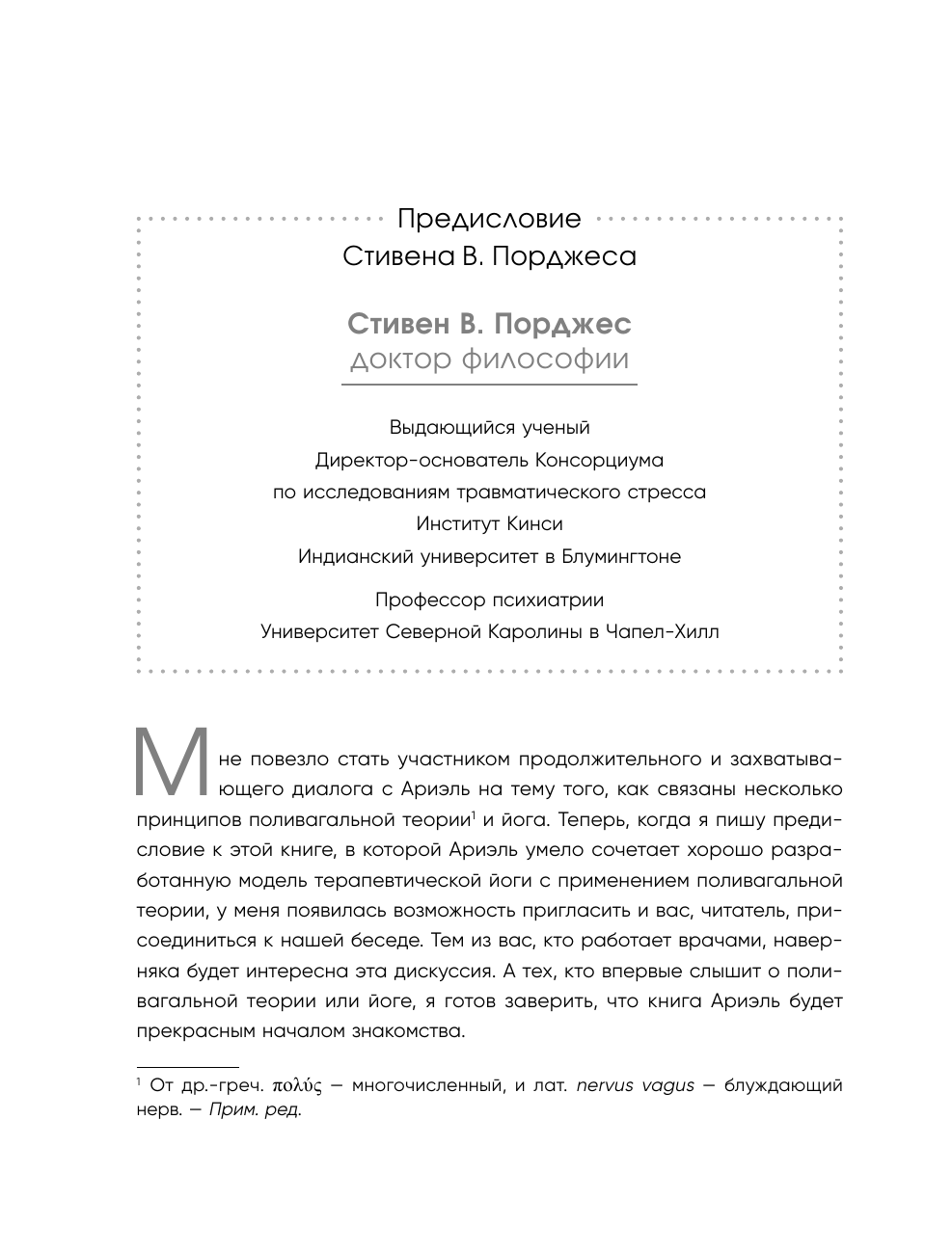 Йога — проверенный путь к налаживанию связи между телом и психикой. Ариэль Шварц, психолог и преподаватель йоги, абсолютно уверена в правдивости этого утверждения. На страницах своей книги она расскажет, что разрывает связь мозга с телом, провоцируя напряжение, хроническую боль и различные заболевания. Автор предлагает использовать ресурсы тела для того, чтобы в буре стрессов сохранить твердую почву под ногами и не позволить травмирующим событиям выбить ее из-под ног. В этой книге она проведет вас путем йога, познавшего в совершенстве себя и свое тело. Путем того, кто убедился, что травмирующие события могут стать поводом для духовного роста. Книга получила положительные отзывы Тиффани Круикшанк — всемирно известного инструктора по йоге, а также доктора философии, профессора психиатрии, выдающегося ученого Стивена В. Порджеса.
