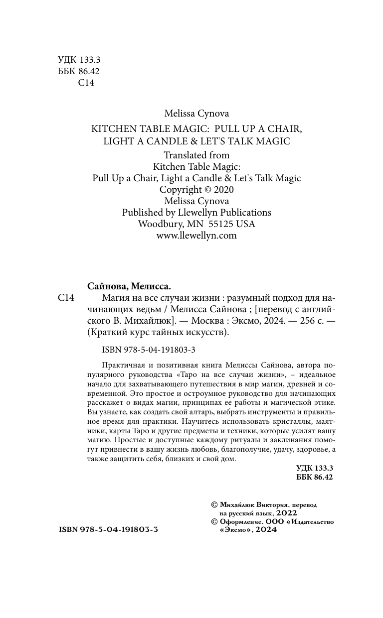 Практичная и позитивная книга Мелиссы Сайнова, автора популярного руководства «Таро на все случаи жизни», — идеальное начало для захватывающего путешествия в мир магии, древней и современной. Это простое и остроумное руководство для начинающих подойдет тем, кто верит в житейскую мудрость, опыт, разумный и взвешенный подход ко всему, даже к магическим практикам. Из этой книги вы узнаете: • Что такое магия, какой она бывает и как работает. • Какие магические инструменты вам понадобятся и как их использовать. • Как создать свой алтарь и священное пространство для заклинаний и ритуалов. • Как выбрать наилучшее время для магической работы. • Как при помощи различных заклинаний и ритуалов, включающих работу со свечами, кристаллами, картами Таро и стихиями, «прокачать» важнейшие сферы жизни. Мелисса Сайнова — опытный таролог и ведьма с многолетним стажем, автор остроумного руководства для начинающих «Таро на все случаи жизни». Мелисса профессионально гадает на картах, а также проводит мастер-классы по магии и Таро и участвует в тематических конференциях.