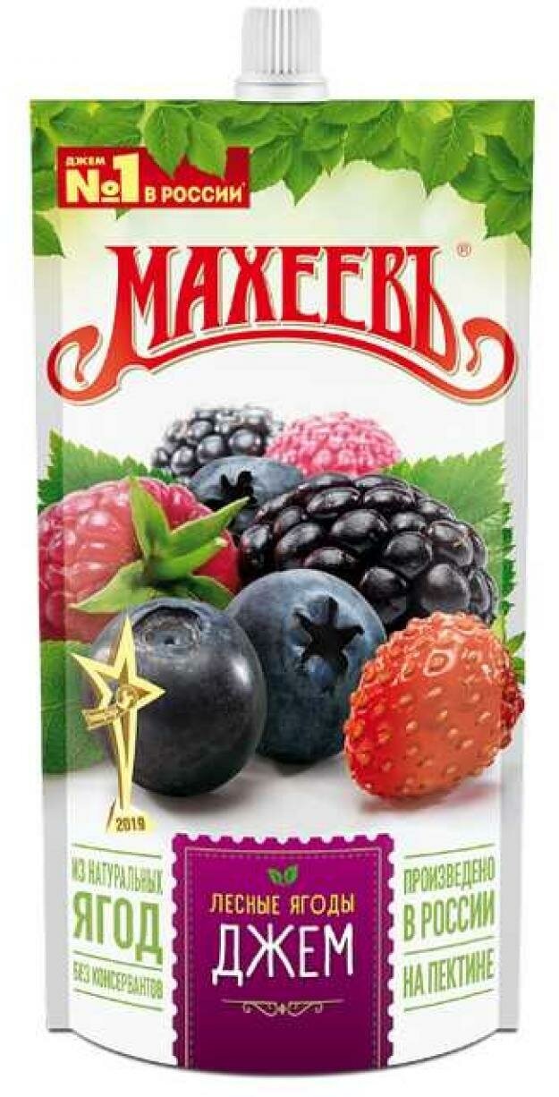Джем Махеевъ Лесные ягоды приготовлен из спелых ягод ежевики, голубики, черники, малины и земляники. Содержит большое количество витаминов и антиоксидантов.