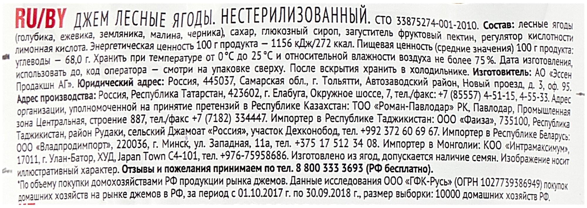 | Состав | лесные ягоды (ежевика, голубика, малина, черника, земляника), сахар, глюкозно-фруктозный сироп, загуститель фруктовый пектин, регулятор кислотности лимонная кислота |