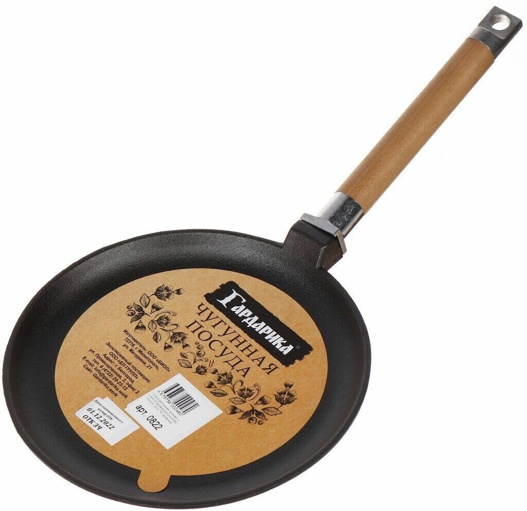 Сковорода блинная чугунная 24см со съемной ручкой ТМ Гардарика. Подходит ко всем видам плит, в том числе к индукции. Не рекомендуется мытье в посудомоечной машине. Сковорода со съемной ручкой подойдет для использования в духовке.