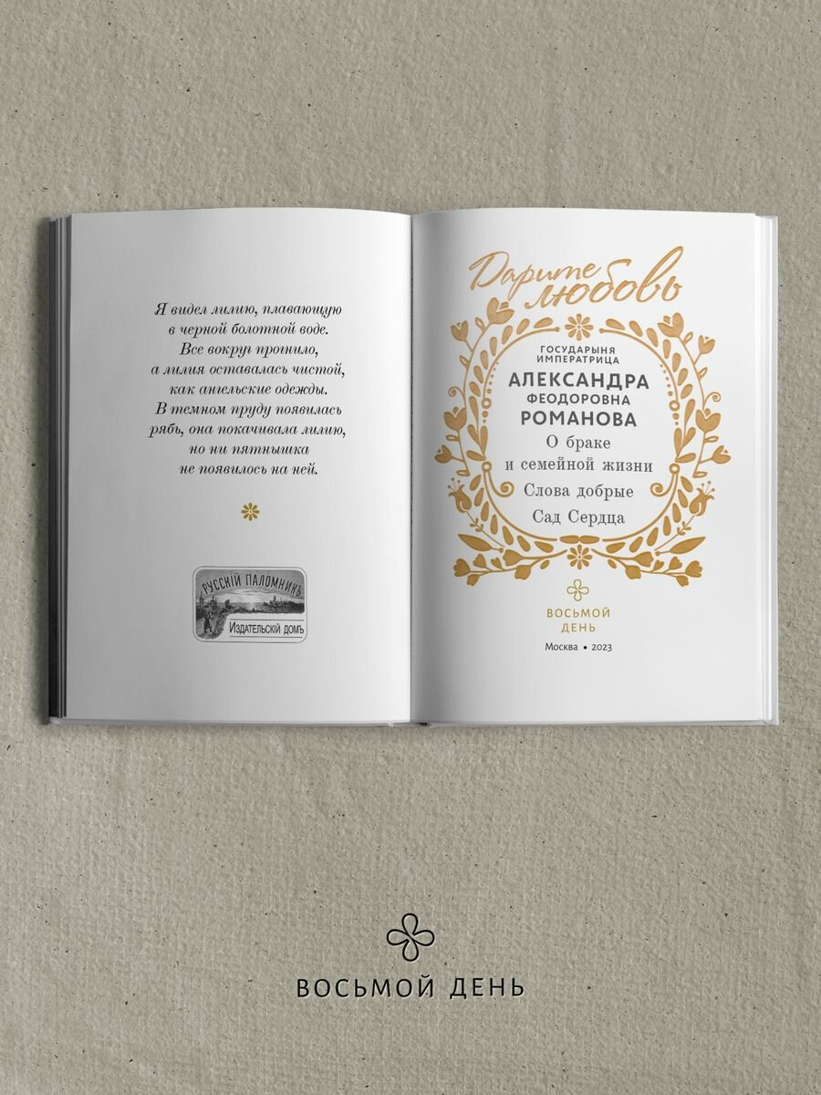 "Дарите любовь" - слова, которые написала Государыня Императрица Александра Феодоровна Романова в своем дневничке за 1917 год, размышляя о миротворцах, людях которые своим благородством преображают окружающую их действительность. "Еще одна возможность снискать славу миротворца - распространять христианскую любовь. Мы можем делать это примером собственной жизни, выказывая терпение, мягкость, выдержку, где бы мы ни находились, как бы дурно с нами ни обращались". "Дарите любовь" - это дневниковые записи Государыни, выборка из книги нашего издательства - книги писем и дневниковых записей Александры Феодоровны "Дивный свет". Дневники были написаны Императрицей на английском языке и были собраны кропотливым трудом монахини Нектарии (Мак Лиз). Главы, помещенные здесь, вышли отдельными изданиями: "О браке и семейной жизни", "Слова добрые" и "Сад сердца". Как и сама книга, эти главы разошлись огромными тиражами как по России, так и по всему свету. Ценность всех этих дневниковых записей представляется в том, что святая Царица сама в них свидетельствует о себе. Они не есть исследования и мнения неких авторов - благо- или зложелательных, патриотов или космополитов, верных Христу или неверных. Одни из них нечаянно и невольно могут отклоняться от правды, другие намеренно искажают ее. Записи эти не предназначались к публикации и писались для себя, в тайне. Невозможно было представить, что они смогли бы увидеть свет, передаваясь, скорее всего, из поколения в поколение Царского Дома Романовых. После революции они стали особо охраняемыми документами с грифом "совершенно секретно", и публикация их была также немыслима. Но Богу было угодно, чтобы эти драгоценные жемчужины дивной духовной красоты стали известны миру. И как бы хотелось, чтобы они стали доступны всем наследникам Руси Святой. Чтобы воссияла красота души Императрицы и стала бы звездой путеводной во тьме века сего для ищущих чистоты и благородства. Ведь "Никто, зажегши свечу, не ставит ее в сокровенном месте, ни под сосудом, но на подсвечнике, чтобы входящие видели свет". (Лк. 11, 33). Благодарим Бога, что Он сподобил и нас потрудиться ради этого, но и осознаем силы свои скудные. Поэтому и просим Вас Бога ради, дорогие наши читатели, потрудитесь с нами! Да распространятся сии "слова добрые" по всему свету. Подарите ближним и дорогим Вам людям возможность прикоснуться к "Дивному свету" души Государыни. Передайте, подарите книжечку сию тем, кто Вам дорог. Ведь в ней есть сила способная изменить жизнь! Дарите любовь! Дорогой читатель, если коснулись строки сии души твоей, и ответила она им чувством светлым, то не лиши такой радости и окружающих тебя. Прочел и полюбил, поделись с ближним. Дарите любовь!