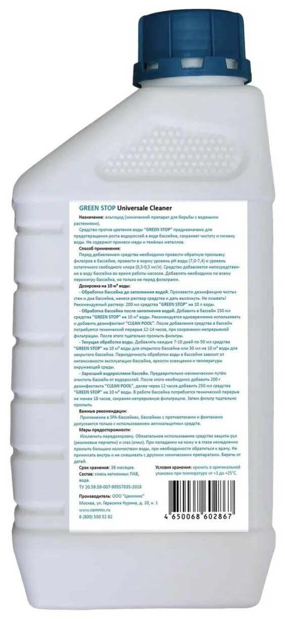 **Средство дезинфицирующее для бассейна Cemmix GreenStop 1 л** защищает и осветляет воду бассейна, предотвращает разрастание водорослей. Подходит для обработки бассейна до и после наполнения водой, профилактики и очистки заросшего водорослями бассейна. В упаковке 1 литр. Перед обработкой бассейна нужно произвести обратную промывку фильтров и отрегулировать pH по инструкции. Раствор заливается под напор воды для равномерного распределения по бассейну, исключая зону перед фильтрами.