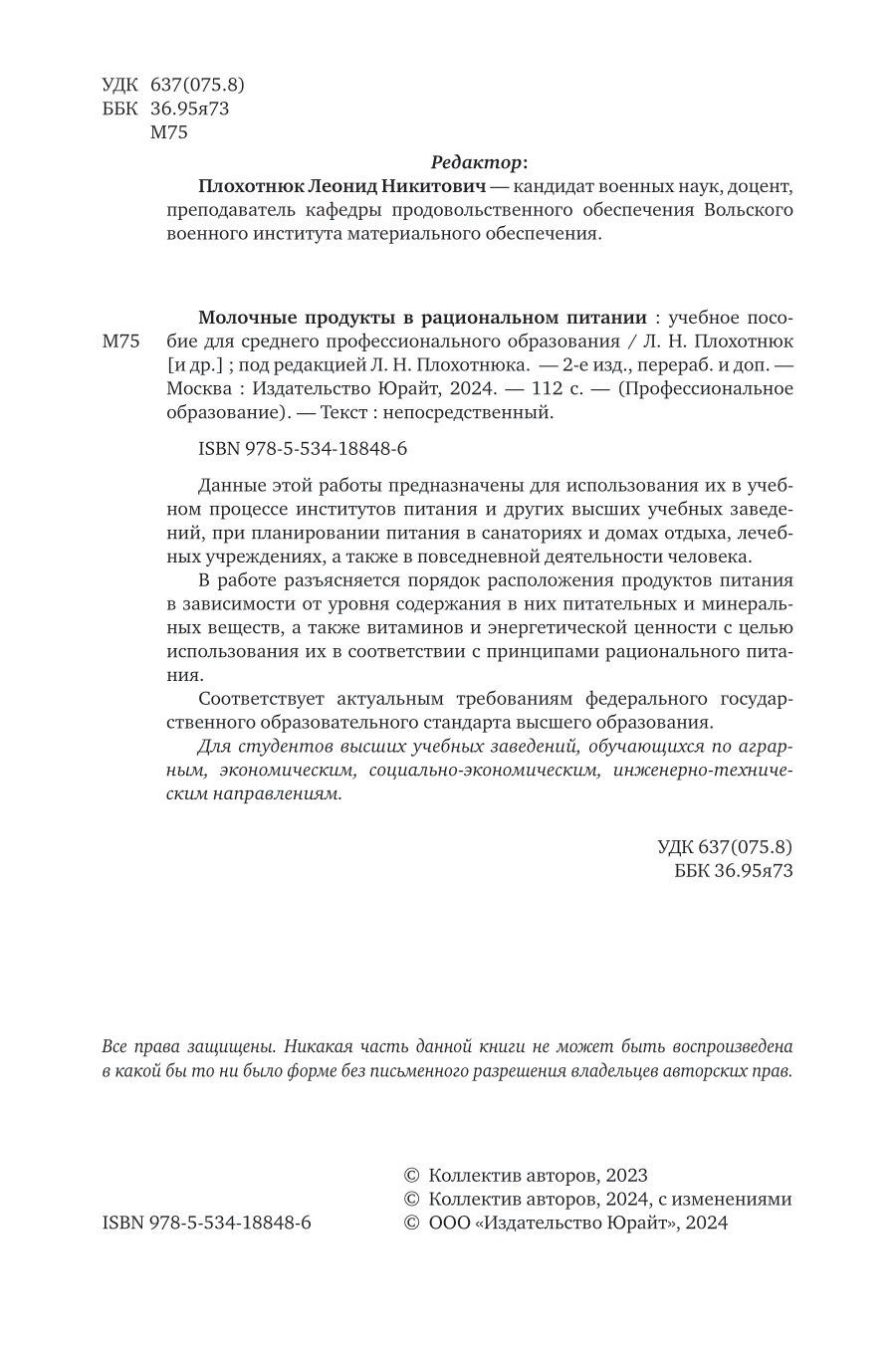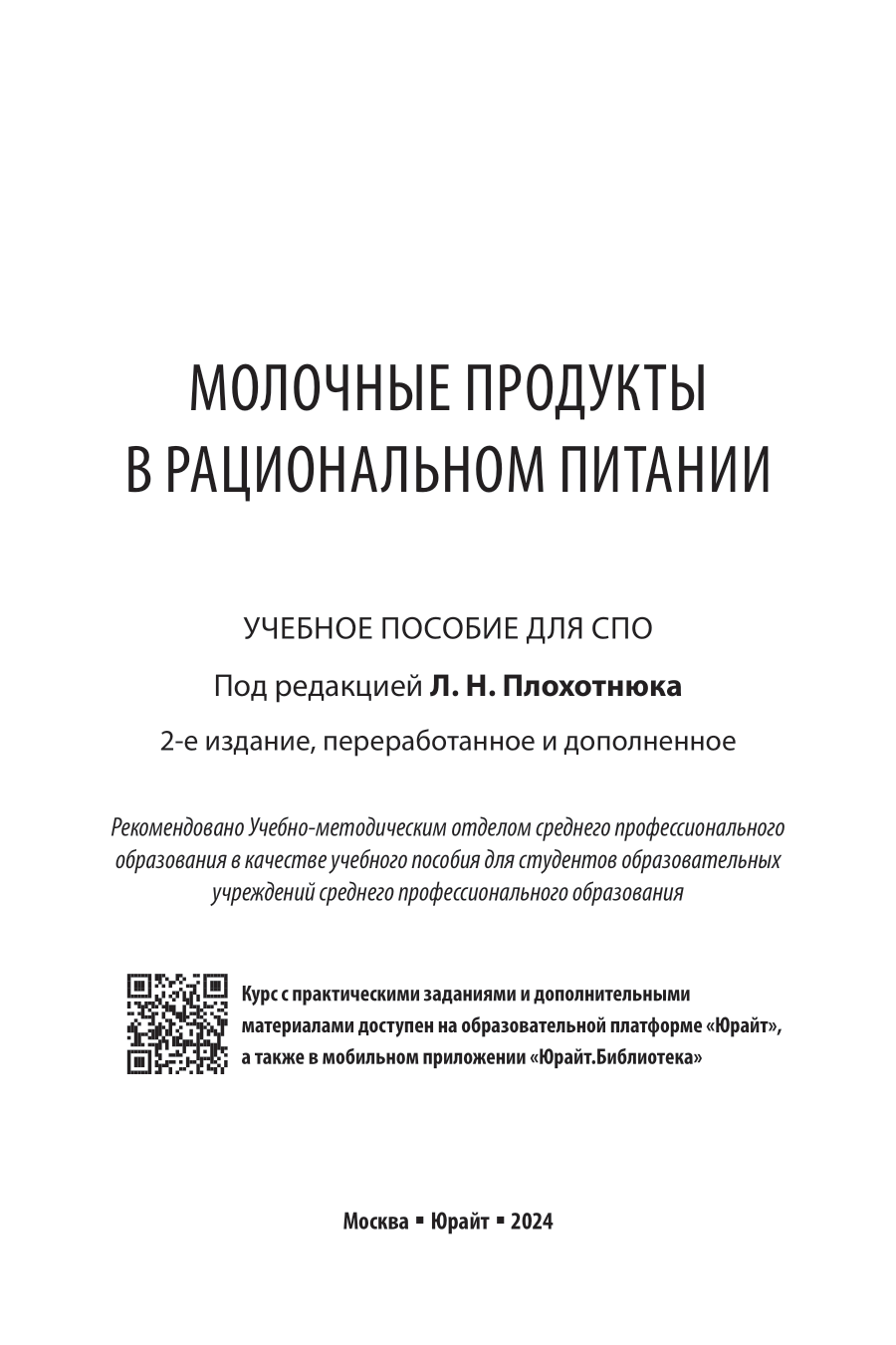 Молочные продукты в рациональном питании 2-е изд. пер. и доп. Учебное пособие для СПО (Татьяна Александровна Пасечникова); ЮРАЙТ, 2024