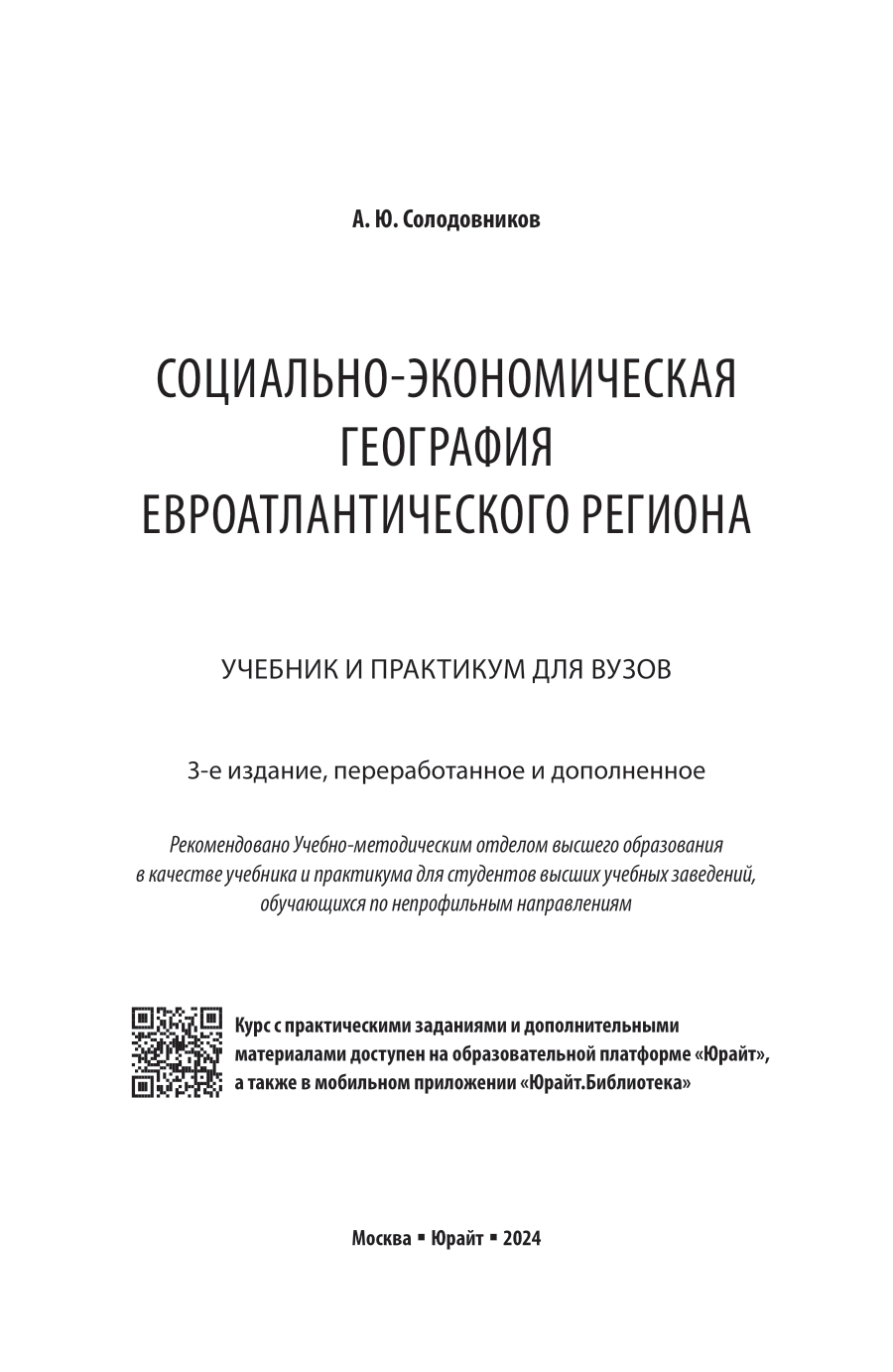 Социально-экономическая география евроатлантического региона 3-е изд. пер. и доп. Учебник и практикум для вузов (Александр Юрьевич Солодовников); ЮРАЙТ, 2024