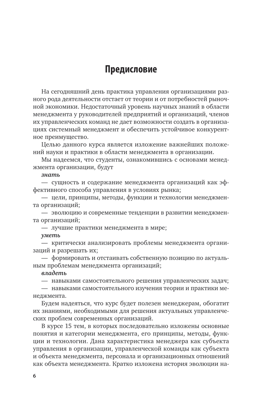 Целью данного курса является изложение важнейших положений науки и практики в области менеджмента в организации. Рассмотрены основные принципы, методы и функции менеджмента, организационное проектирование и планирование, способы разработки управленческих решений. Уделено внимание различным стилям менеджмента, вопросам контроля и выстраивания организационных отношений с персоналом. Отдельные темы посвящены эволюции научных теорий в области менеджмента и сравнению национальных моделей управления. Соответствует актуальным требованиям федерального государственного стандарта высшего образования. Для студентов высших учебных заведений, изучающих дисциплины «Менеджмент», «Корпоративное дело», также может быть полезно самостоятельно изучающим теорию и практику менеджмента.