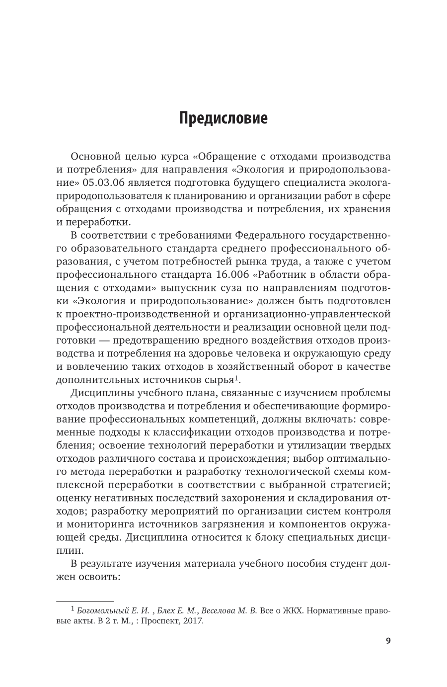 Изложены общие принципы планирования и организации работ по обращению с твердыми отходами производства и потребления, эколого-экономические и технологические аспекты их хранения и принципы комплексной переработки. Рассмотрены вопросы экологической безопасности при обращении с отходами, которая обеспечивается современными методами контроля и мониторинга. Описаны современные технологии, обеспечивающие эффективную сортировку и переработку промышленных и твердых коммунальных отходов (ТКО), а также существующие концепции и государственная стратегия управления муниципальными отходами. Учебное пособие имеет научно-теоретическое и прикладное назначение, поскольку освещает физико-химические, биохимические и технологические основы переработки и утилизации отходов, а также основы стратегии управления и документирования деятельности в этой сфере.