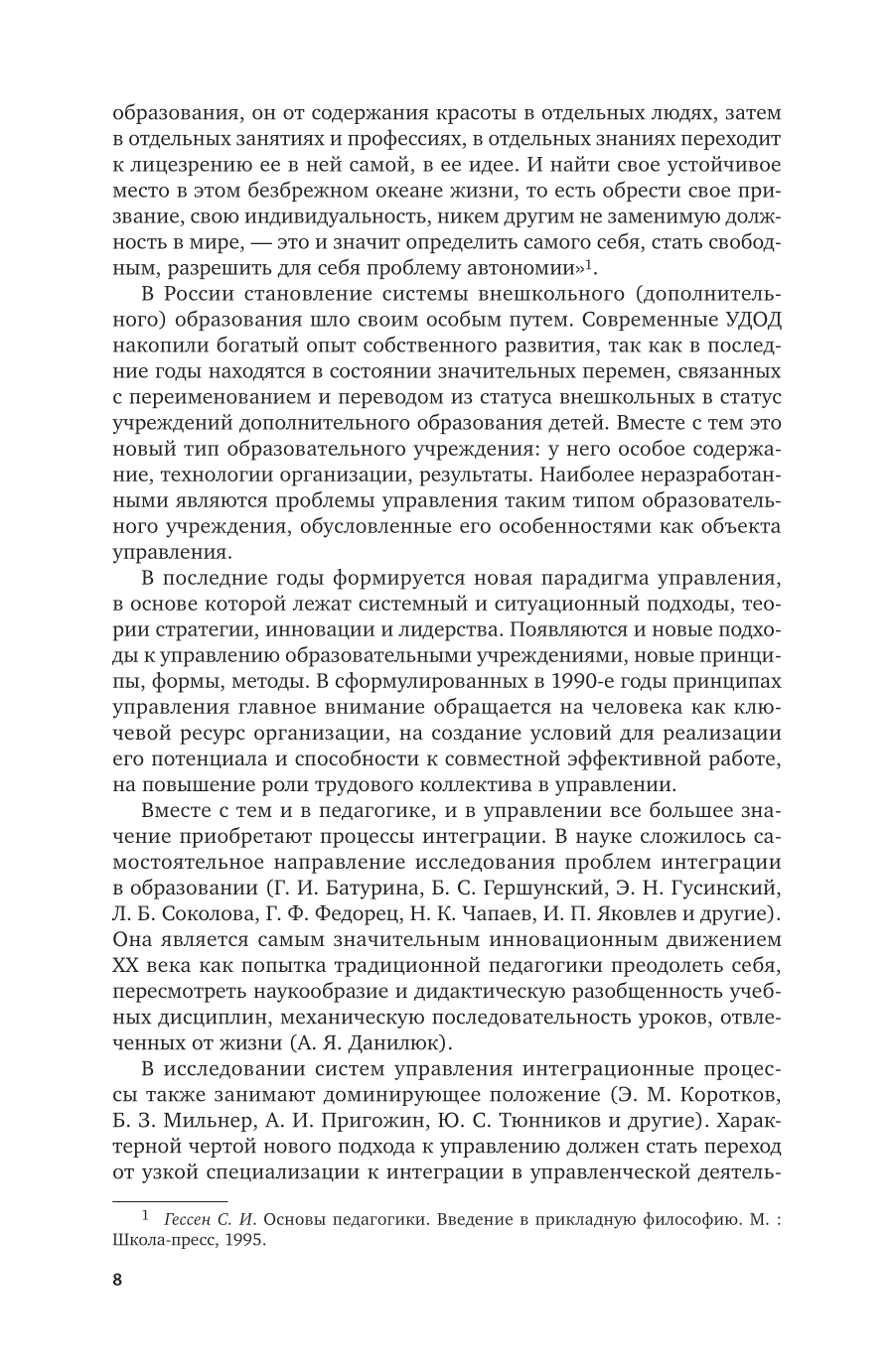 В настоящем курсе изложены концепции управления учреждением дополнительного образования детей с применением интегративно-вариативного подхода. Учебный материал курса четко систематизирован, а также дополнен практическими материалами, которые успешно применяются в учреждениях дополнительного образования детей. Соответствует актуальным требованиям федерального государственного образовательного стандарта высшего образования. Адресовано студентам педагогических вузов, а также работникам системы образования, научным сотрудникам и преподавателям вузов.