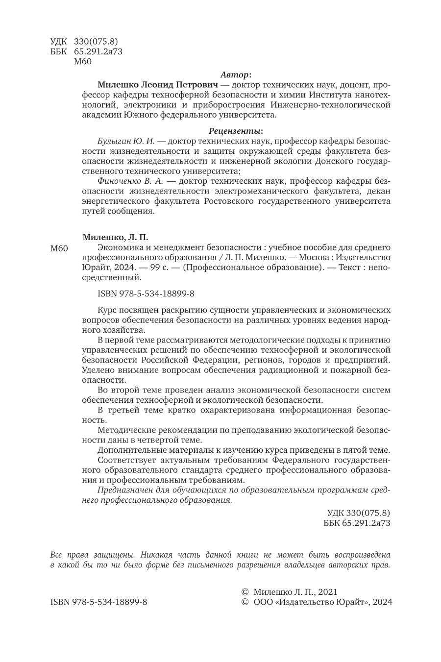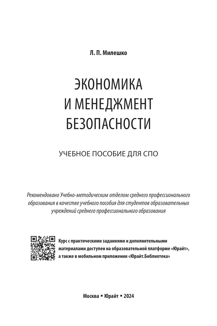 Экономика и менеджмент безопасности. Учебное пособие для СПО (Леонид Петрович Милешко); ЮРАЙТ, 2024