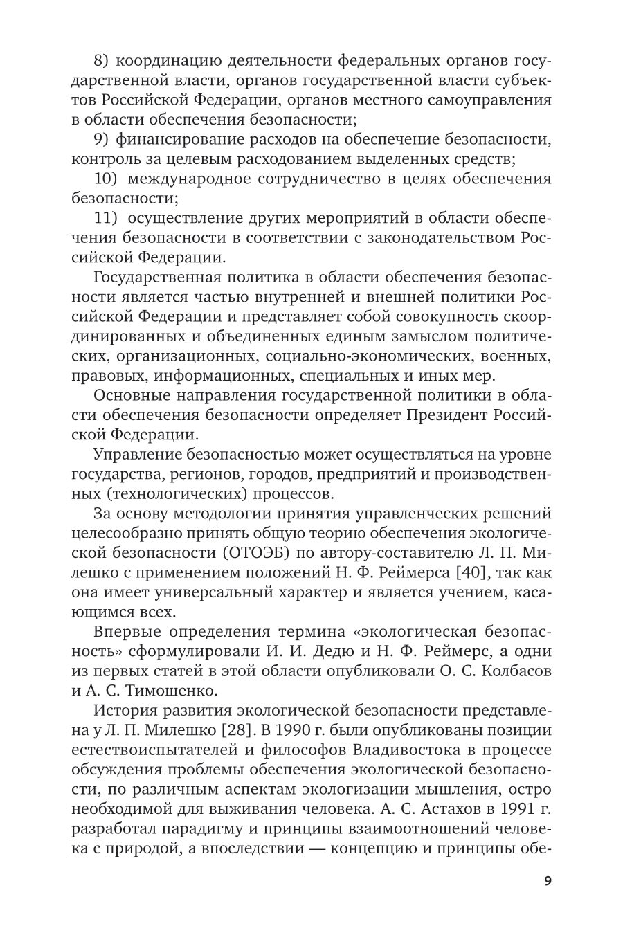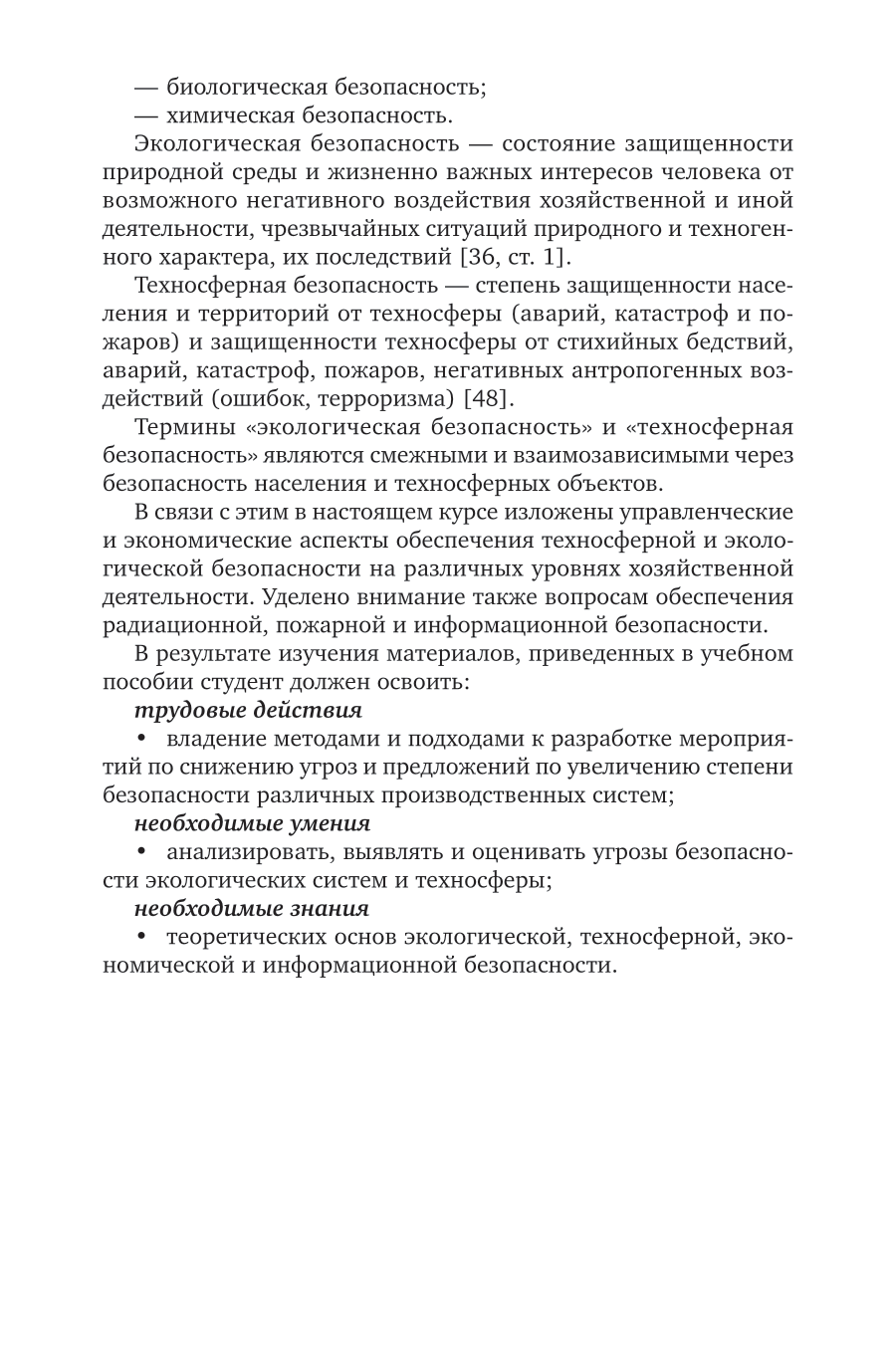 Курс посвящен раскрытию сущности управленческих и экономических вопросов обеспечения безопасности на различных уровнях ведения народного хозяйства. В первой теме рассматриваются методологические подходы к принятию управленческих решений по обеспечению техносферной и экологической безопасности Российской Федерации, регионов, городов и предприятий. Уделено внимание вопросам обеспечения радиационной и пожарной безопасности. Во второй теме проведен анализ экономической безопасности систем обеспечения техносферной и экологической безопасности. В третьей теме кратко охарактеризована информационная безопасность. Методические рекомендации по преподаванию экологической безопасности даны в четвертой теме. Дополнительные материалы к изучению курса приведены в пятой теме. Соответствует актуальным требованиям Федерального государственного образовательного стандарта среднего профессионального образования и профессиональным требованиям. Предназначен для обучающихся по образовательным программам среднего профессионального образования.