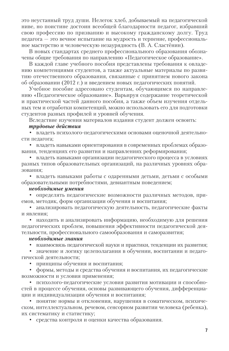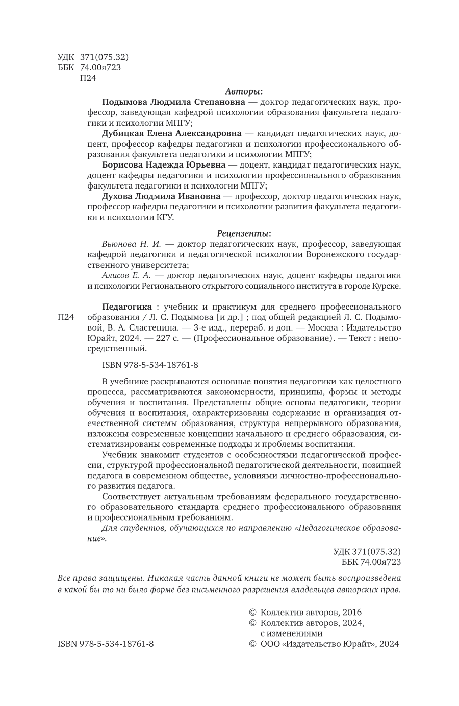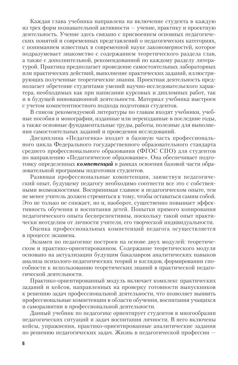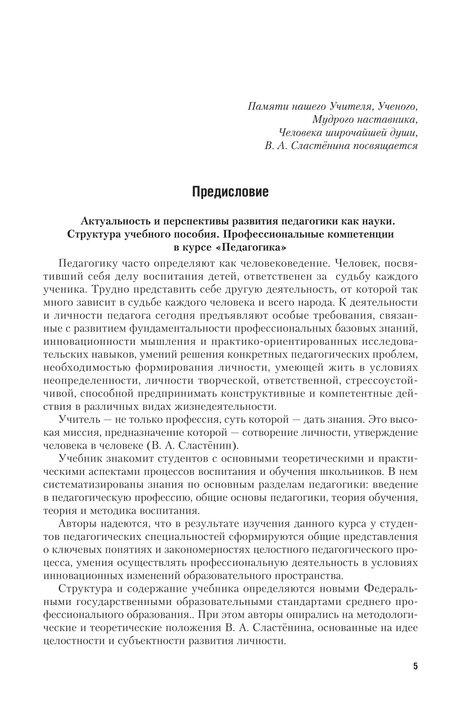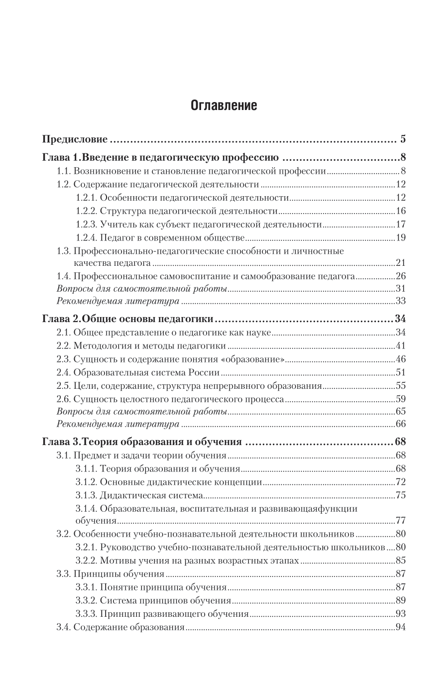 Авторы издания опирались на методологические и теоретические положения выдающегося российского ученого и педагога Виталия Александровича Сластенина. Учебник знакомит с основными теоретическими и практическими аспектами процессов воспитания и обучения школьников. В нем систематизированы знания по основным разделам педагогики: введение в педагогическую профессию, общие основы педагогики, теория обучения, теория и методика воспитания. Материал учебника направлен на включение студента в каждую из трех форм познавательной активности учение, практику и проектную деятельность. После каждой главы приведены вопросы и задания для самостоятельной работы, а также рекомендуемая литература.