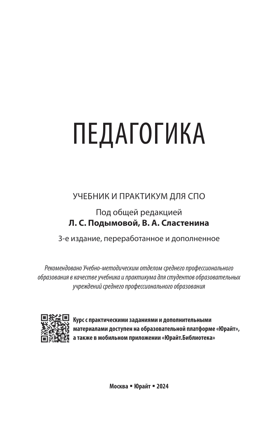 Педагогика 3-е изд. пер. и доп. Учебник и практикум для СПО (Виталий Александрович Сластенин); ЮРАЙТ, 2024