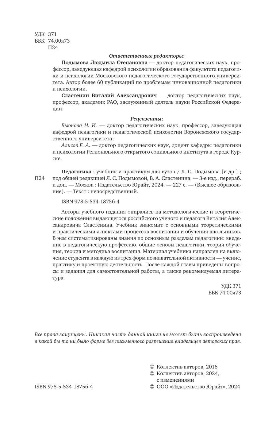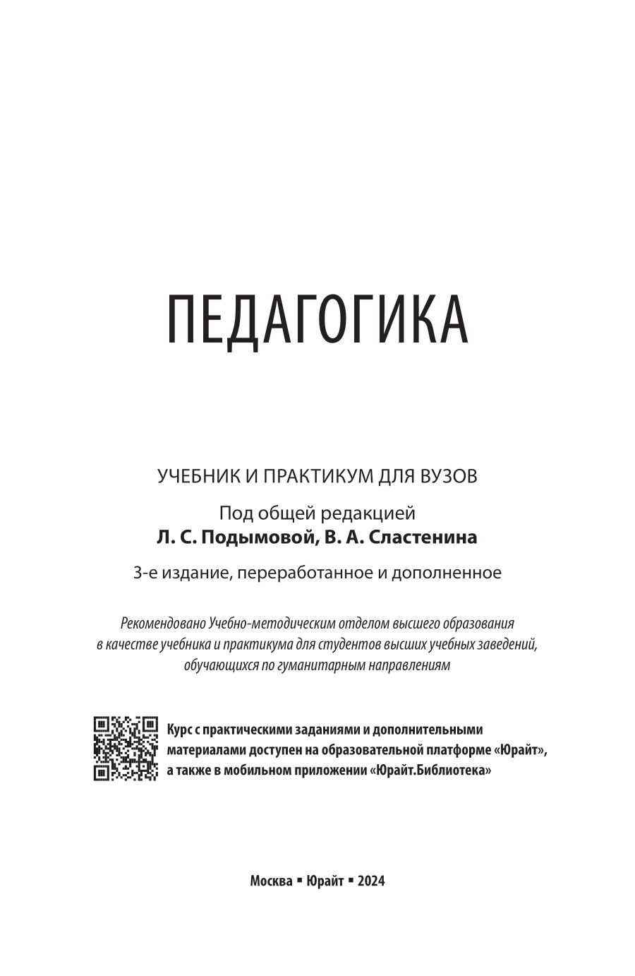 Педагогика 3-е изд. пер. и доп. Учебник и практикум для академического бакалавриата (Виталий Александрович Сластенин); ЮРАЙТ, 2024