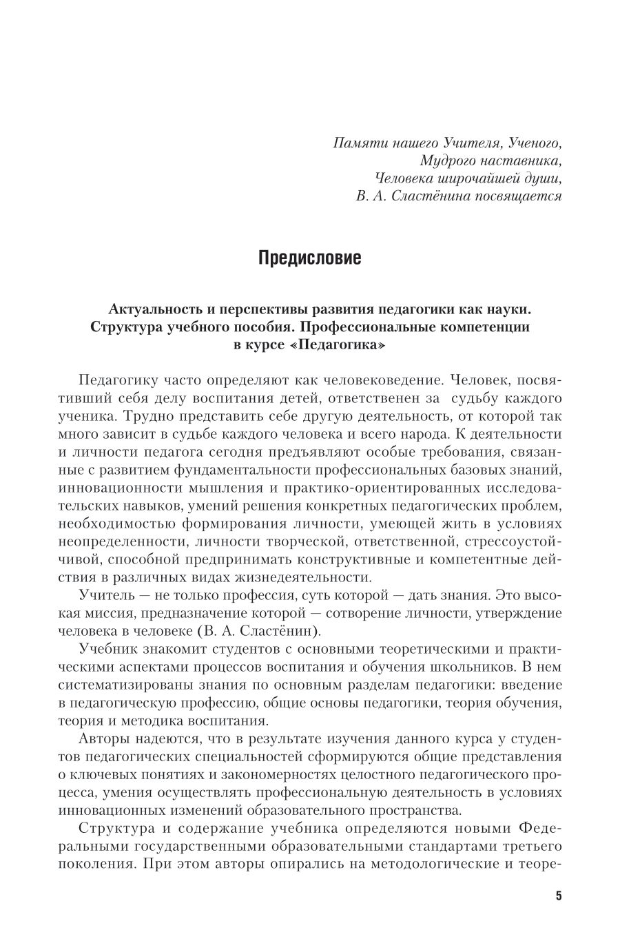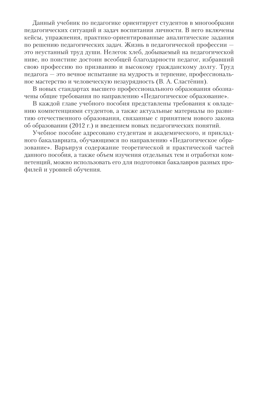 Авторы курса опирались на методологические и теоретические положения выдающегося российского ученого и педагога Виталия Александровича Сластенина. Курс знакомит с основными теоретическими и практическими аспектами процессов воспитания и обучения школьников. В нем систематизированы знания по основным разделам педагогики: введение в педагогическую профессию, общие основы педагогики, теория обучения, теория и методика воспитания. Материал курса направлен на включение студента в каждую из трех форм познавательной активности учение, практику и проектную деятельность. После каждой темы приведены вопросы и задания для самостоятельной работы, а также рекомендуемая литература.
