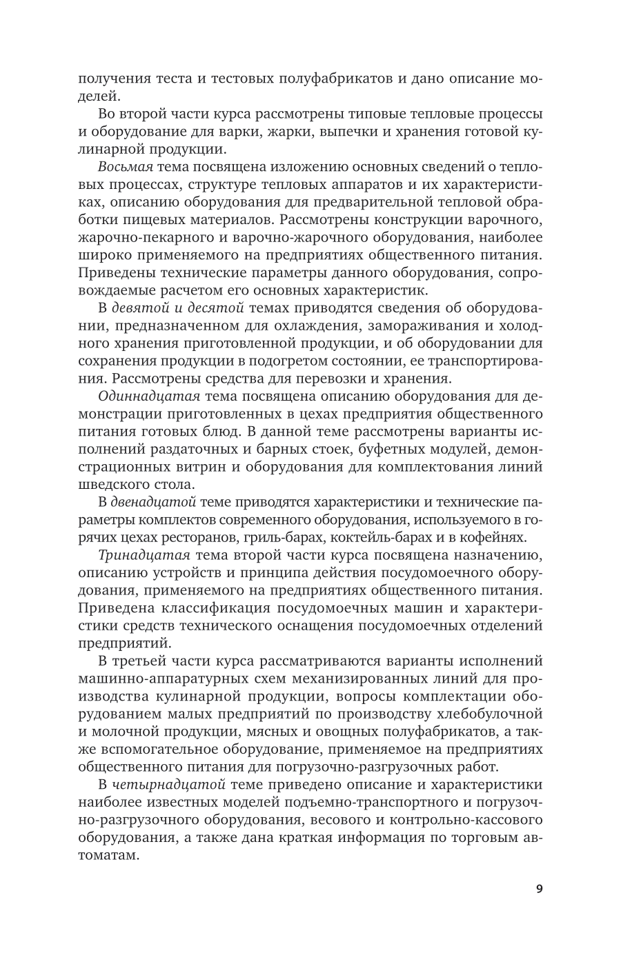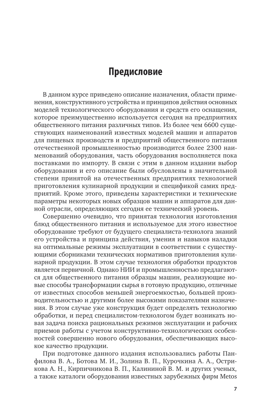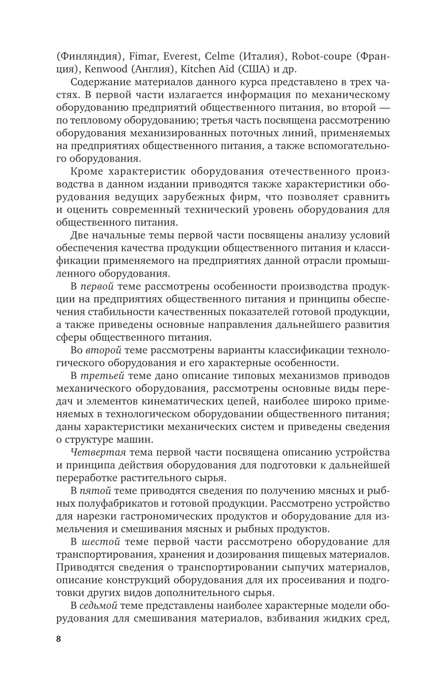 Приведено описание устройства и принципа работы отечественного и зарубежного технологического оборудования для предприятий общественного питания и средств его технического оснащения. Дана классификация оборудования. Рассмотрены типовые модели машин и аппаратов для обработки пищевого сырья, получения полуфабрикатов и готовой продукции, вспомогательного оборудования, а также оборудования для обслуживания посетителей, и приведены их технические параметры. Приведены примеры механизированных линий для производства пищевой продукции, используемой в общественном питании. Даны характеристики оборудования специализированных предприятий общественного питания: ресторанов, гриль-баров, коктейль-баров и др. Рассмотрена структура, оборудование и принципы обслуживания посетителей шведского стола, организуемого на предприятиях общественного питания. Приведены типовые механизмы, применяемые в приводах технологического оборудования. Соответствует актуальным требованиям федерального государственного образовательного стандарта высшего образования. Издание рекомендуется для студентов вузов в качестве учебника по обязательной дисциплине «Оборудование предприятий общественного питания», обучающихся по направлению подготовки «Технология продукции и организация общественного питания», и, кроме того, может быть полезно для студентов по направлению подготовки «Технологические машины и оборудование», а также для магистрантов и аспирантов.
