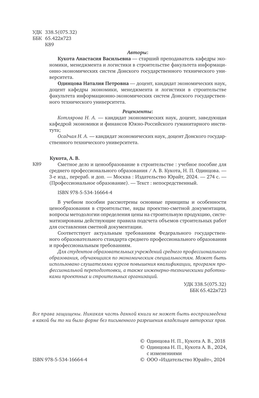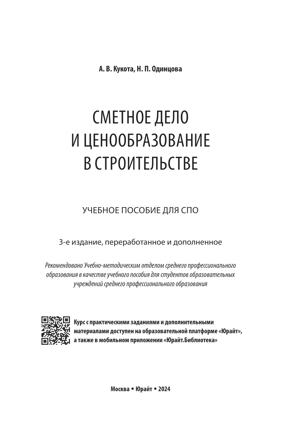 Сметное дело и ценообразование в строительстве 3-е изд. пер. и доп. Учебное пособие для СПО (Анастасия Васильевна Кукота); ЮРАЙТ, 2024