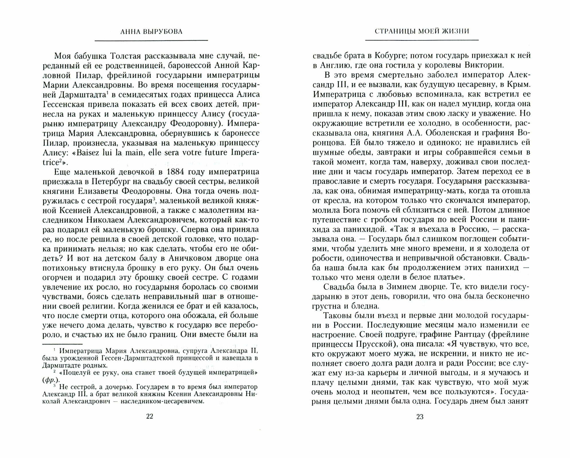 Анна Александровна Вырубова (девичья фамилия Танеева) - близкий к царской семье человек, подруга императрицы Александры Федоровны, одна из немногих, кто не отрекся от Романовых в 1917 году. Придворную должность фрейлины Анна Вырубова занимала недолго, только до замужества, короткого и неудачного, а потом оставалась для императорской фамилии просто другом. Императрица Александра Федоровна нелегко сходилась с людьми, и те, кто был к ней приближен, сталкивались с завистью и сплетнями со стороны придворного окружения. Не миновала эта участь и Анну Вырубову. Особенно яркими и дикими подробностями сплетники старались разукрасить ее знакомство с Распутиным, состоявшееся благодаря императрице. Диким гонениям, издевательствам, доносам, тюремным заключениям Анна Вырубова стала подвергаться сразу после отречения Николая П, но претерпела все, не предав царскую семью, к которой была искренне привязана. И только в своих воспоминаниях, немного наивных и откровенных, постаралась раскрыть правду. Первые издания воспоминаний А.А. Вырубовой сопровождались публикацией писем к ней членов царской семьи (Париж, 1922) и писем самой Анны из тюрьмы к родителям и знакомым в послереволюционный период (Берлин, 1923). Эти письма, как представляющие большой исторический интерес, включены в приложение к данному изданию.