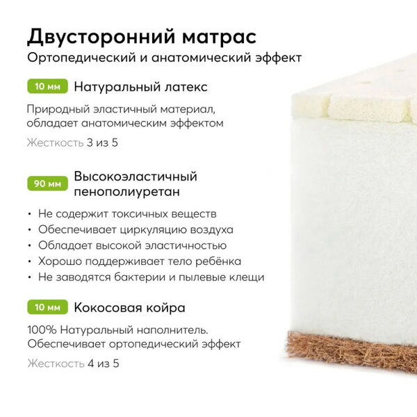 Модель двусторонняя. Одна из поверхностей покрыта слоем кокосовой койры для максимального ортопедического эффекта, необходимого новорожденному (толщина 10 мм, жесткость 4 из 5). Вторая — слоем натурального латекса. Природный эластичный материал подарит ребенку особый комфорт и обладает анатомическим эффектом благодаря точечному распределению нагрузки. На этой стороне мы рекомендуем спать детям после года (слой 10 мм, жесткость 3 из 5).