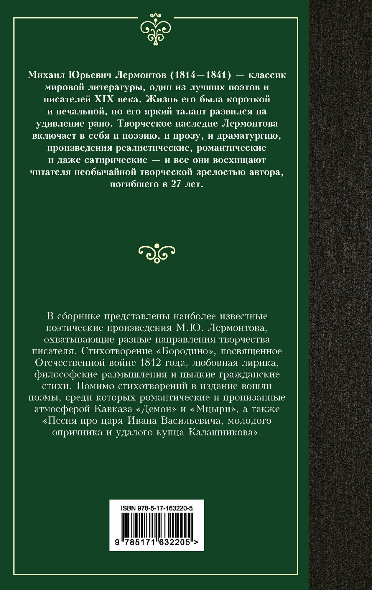В сборнике представлены наиболее известные поэтические произведения М. Ю. Лермонтова, охватывающие разные направления творчества писателя. Стихотворение "Бородино", посвященное Отечественной войне с Наполеоном, любовная лирика, философские размышления и пылкие гражданские стихи.