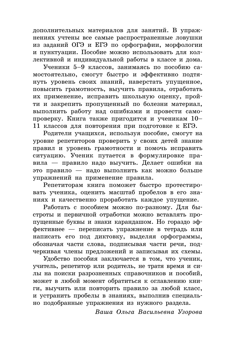 Русский язык – один из ключевых школьных предметов, и от знания его правил зависят результаты итоговых контрольных работ, ОГЭ и ЕГЭ. Перед вами профессионально составленное пособие по русскому от признанных «звезд» педагогики – Ольги Узоровой и Елены Нефедовой. Оно поможет вам максимально быстро и легко освоить премудрости родного языка, грамматику, орфографию и пунктуацию.