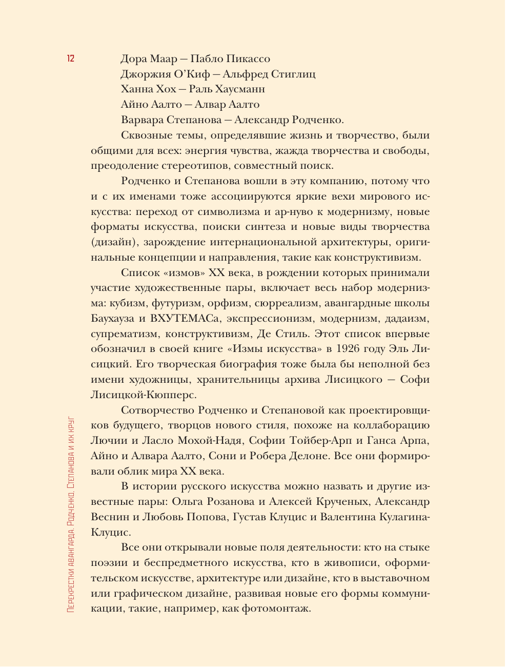 Перекрестки авангарда — это книга-хроника из жизни семейной пары творцов русского авангарда, основоположников современного дизайна и фотоискусства: Александра Родченко и Варвары Степановой. Они работали со всеми, искусство составляло смысл их жизни, а их жизнь и была искусством. Выбраны 10 дней из более чем сорокалетней совместной жизни и творчества, 10 пересечений-перекрестков с различными видами искусства, друзьями, коллегами, единомышленниками, в числе которых поэт Владимир Маяковский и художники Владимир Таллин, Василий Кандинский, Казимир Малевич, режиссеры Сергей Эйзенштейн и Всеволод Мейерхольд, архитекторы Константин Мельников и Александр Веснин.