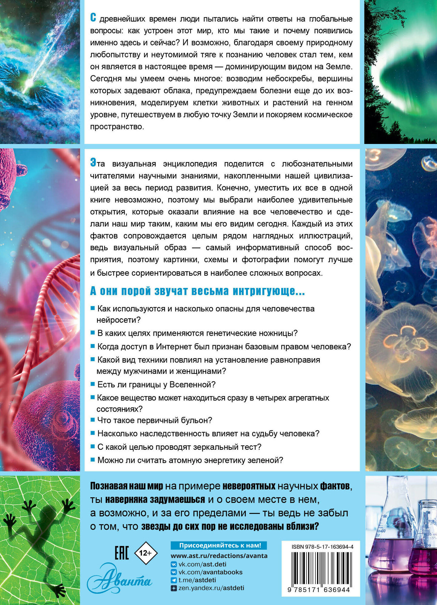 В книге описываются ключевые научные открытия человеческой цивилизации, оказавшие огромное влияние на формирование современного мира. Например, сегодня невозможно представить нашу жизнь без электричества и бесчисленного множества высокотехнологичных приборов, быстрого транспорта и мгновенного обмена информацией с любой точкой мира. Мы знаем, как устроена наша Вселенная, из чего состоит и какие свойства имеет любая окружающая нас материя. Но все эти знания человек получил не сразу, на пути к познанию он совершал ошибки, часто заблуждался, однако в итоге всегда находил верное решение благодаря своей любознательности и стремлению к познанию. Самые интересные научные факты обо всем на свете — о природе Земли и космическом пространстве, горных вершинах и океанских глубинах, строении клеток и о многом другом — увлекательно изложены в этой визуальной энциклопедии. Все они сопровождаются наглядными иллюстрациями и подробными схемами, которые помогут юным читателям разобраться в наиболее сложных вопросах. Благодаря этому изданию они смогут узнать самые удивительные факты из современного мира науки, о которых многие их сверстники даже не подозревают.
