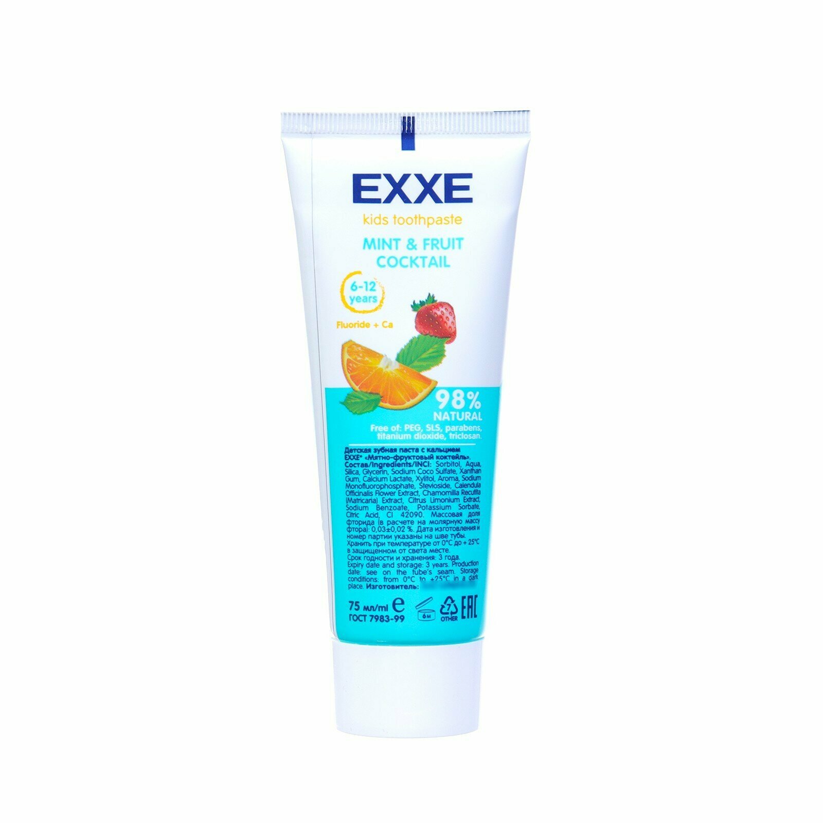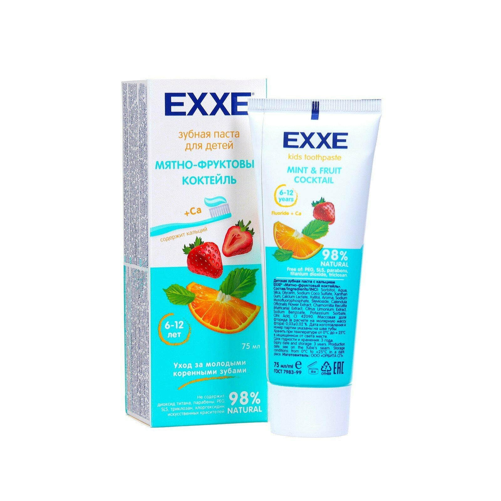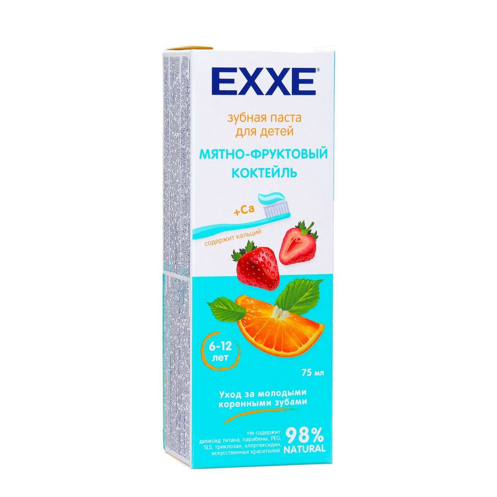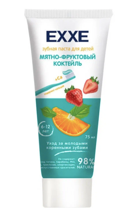 Детская зубная паста с кальцием (для детей 6-12 лет) ТМ EXXE® «Мятно-фруктовый коктейль». 98% NATURAL. Не содержит: диоксид титана, парабены, PEG, SLS, триклозан, хлоргексидин, искусственных красителей.Особая формула с богатым минеральным комплексом и натуральным составом прекрасно подходит для ежедневного ухода за молодыми коренными зубами. Содержит фтор, кальций и ксилит. Укрепляет эмаль, предотвращает образование налёта и защищает от кариеса.Экстракты ромашки и календулы. Натуральные экстракты в составе пасты успокаивают и защищают зубы и дёсны от воспаления.Состав: Sorbitol, Aqua, Silica, Glycerin, Sodium Coco Sulfate, Xanthan Gum, Calcium Lactate, Xylitol, Aroma, Sodium Monofluorophosphate, Stevioside, Calendula Officinalis Flower Extract, Chamomilla Recutita (Matricaria) Extract, Citrus Limonium Extract, Sodium Benzoate, Рotassium Sorbate, Citric Acid, CI 42090.Fluoride fraction 0,03±0,02 %.