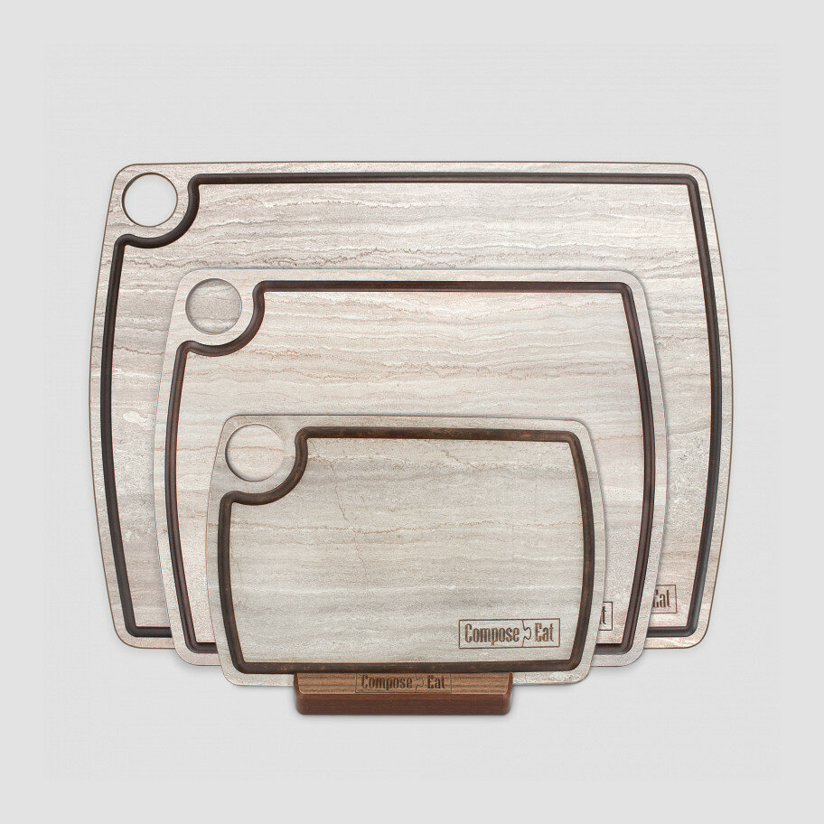 ComposeEat — это новое слово среди разделочных досок, досок для сервировки и кухонных аксессуаров, для производства которых используется супертвёрдый монолитный композитный материал, созданный на основе многослойной крафтовой бумаги. Эти уникальные изделия из композитного материала объединили в себе самые лучшие качества, необходимые для комфортного и многолетнего использования, исключив всевозможные недостатки. Выбор досок и аксессуаров из композитного материала от российского производителя — это многолетняя гарантия качества, длительного срока службы, безопасности и экологичности. Повышенная ударопрочность — сохраняет целостность при падении, ударах и механической нагрузке. Высокая термостойкость — идеален для использования в качестве подставки под горячее, устойчив к резким перепадам температур. Не подвержен деформации — сохраняет насыщенность цвета и текстуры, не деформируется от влаги. Специальное износостойкое покрытие — не подвержен сколам, трещинам и механическим повреждениям, не расслаивается, не крошится, устойчив к порезам. Потребительские качества: Антибактериальные свойства — препятствует размножению бактерий, обладает антимикробным и антигрибковым эффектом. Не впитывает запахи — запахи от ароматных продуктов не впитываются благодаря плотной и непористой структуре. Не повреждает режущую кромку ножа — не оказывает отрицательного влияния на режущую кромку, ножи сохраняют свою первоначальную остроту. Можно мыть в посудомоечной машине на деликатном режиме до 45 °С.