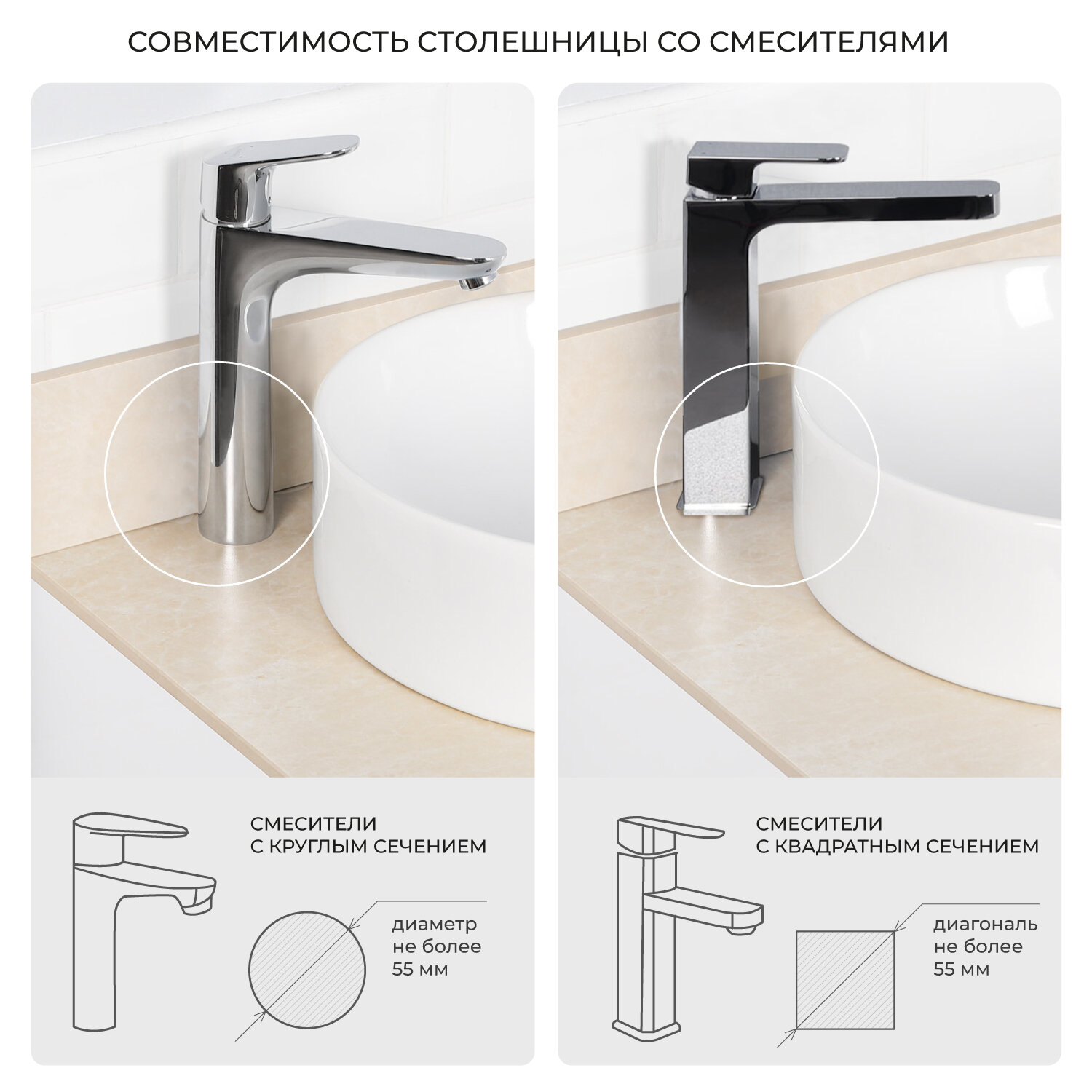 | Форма отверстия под раковину | круглая/прямоугольная |