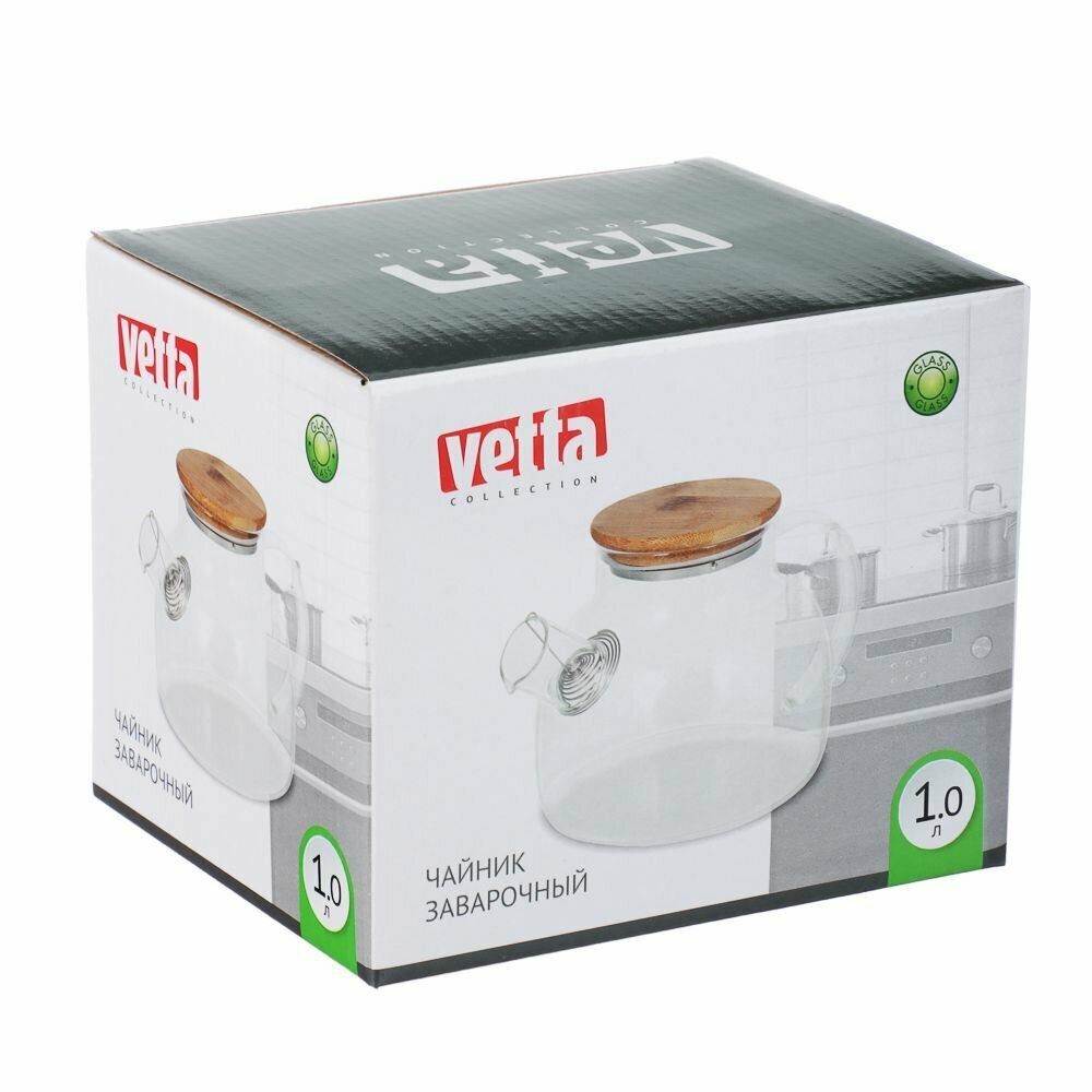 Заварочный чайник Vetta подходит для чаепитий в семье из 4-5 человек или дружеских компаниях. Объем - 1000 мл. Металлический фильтр установлен сверху. Заварка полностью контактирует с водой в чайнике, при этом не попадает в чашки. Чайник из закаленного стекла - легкий, прозрачный, подходит для любого интерьера. Можно мыть в посудомоечной машине. Чайник нельзя подогревать на плите - заливайте в него готовый кипяток. Он станет идеальным презентом на любое событие и порадует даже самых избирательных домохозяек.