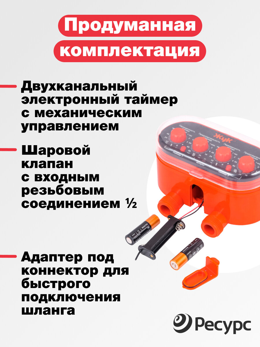 | Комплектация | двухканальный электронный таймер с механическим управлением и шаровым клапаном с входным резьбовым соединением 1/2 и адаптером под коннектор, инструкция |
