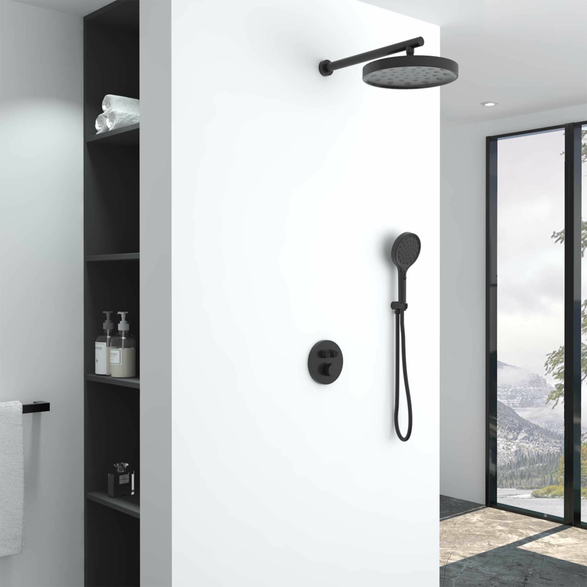 Душевой комплект Inspire VSFW-3I22MT2MB встраиваемый, термостатический, двухрежимный, черный. Верхний душ ABS (режим работы Spray). 4-х режимный ручной душ из ABS cо слайдером (Rain - Pulsating Rain - SPA - Mist). Встраиваемый смеситель c 2-х режимной регулировкой напора воды. Держатель ручного душа из латуни. Размер верхнего душа 300мм. Шланг для душа из ПВХ . Гарантия: 5 лет смеситель, 1 год комплектующие