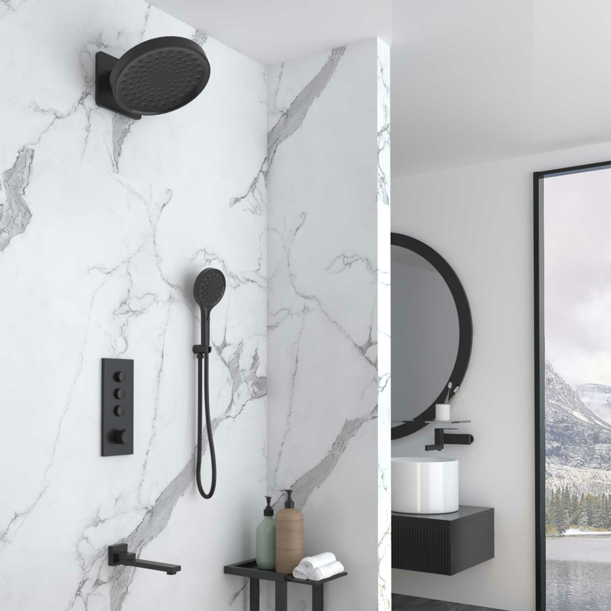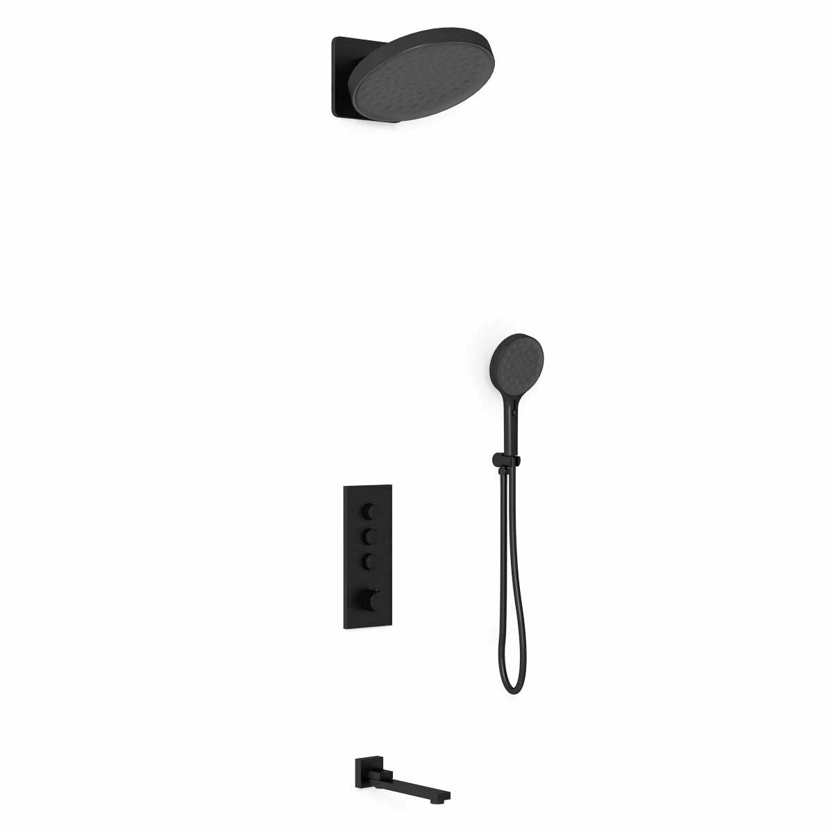 Душевой комплект VSFW-433TI3MB встраиваемый, термостатический, трехрежимный, черный. Верхний душ ABS/латунь (режим работы Rain). 4-х режимный ручной душ из ABS cо слайдером (Rain - Pulsating Rain - SPA - Mist). Держатель ручного душа из латуни. Поворотный излив из латуни. Размер верхнего душа 300мм. Шланг для душа из ПВХ. Гарантия: 5 лет смеситель, 1 год комплектующие