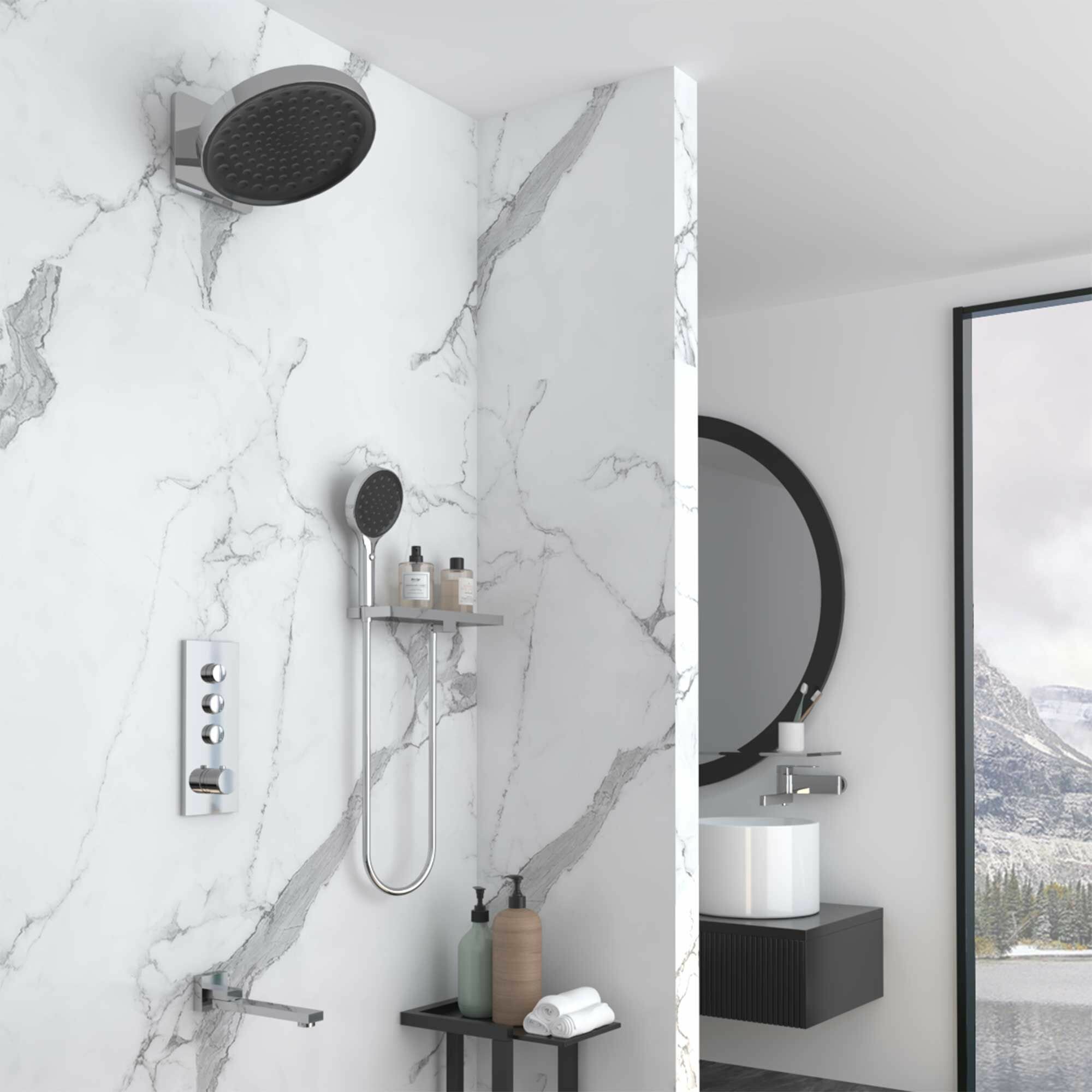 Душевой комплект VSFW-433TI3RCH встраиваемый, термостатический, трехрежимный, хром. Верхний душ ABS/латунь (режим работы Rain). 4-х режимный ручной душ из ABS cо слайдером (Rain - Pulsating Rain - SPA - Mist). Полка с подводкой воды и держателем ручного душа из нержавеющей стали. Поворотный излив из латуни. Размер верхнего душа 300мм. Шланг для душа из ПВХ. Гарантия: 5 лет смеситель, 1 год комплектующие