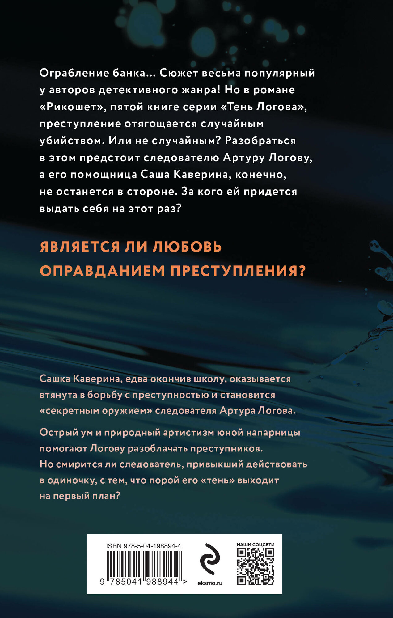 Ограбление банка… Сюжет весьма популярный у авторов детективного жанра! Но в романе «Рикошет», пятой книге серии «Тень Логова», преступление отягощается случайным убийством. Или не случайным? Разобраться в этом предстоит следователю Артуру Логову, а его помощница Саша Каверина, конечно, не останется в стороне. За кого ей придется выдать себя на этот раз?