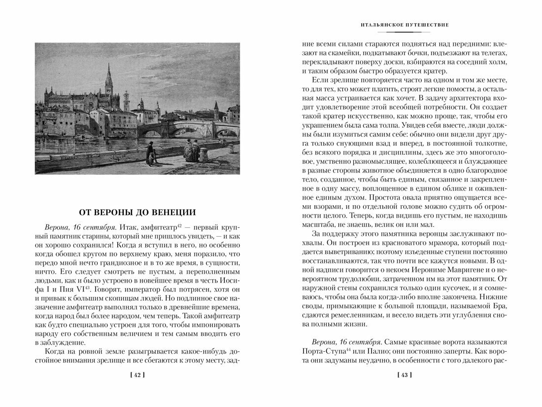 В 1786 г. тридцатисемилетний Иоганн Вольфганг Гёте отправился в Италию. Путешествовал он инкогнито, под именем купца Меллера, и посетил озеро Гарда, Верону, Виченцу, Венецию, Болонью, Рим и Альбанские горы, Неаполь и Сицилию. «Мы все — пилигримы, стремящиеся в Италию; с доверчивой радостью мы поклоняемся рассеянным костям мертвецов», — писал Гёте в Венеции. В 1788 г. поэт вернулся на родину, а в 1816–1817 гг. впервые был опубликован текст его «Итальянского путешествия». Будучи написано спустя многие годы после возвращения автора из поездки, сочинение Гёте отличалось от традиционных путевых заметок. Но, основанное на дневниках и письмах тех лет, «Итальянское путешествие» все же хранит свежесть впечатлений, дополненных зрелыми размышлениями и отшлифованных до подлинного литературного совершенства. Замечательный факт: Иосиф Бродский, составляя свой знаменитый список книг, который должен прочесть каждый, помимо «Фауста», включил в него еще одно сочинение Гёте — восхитительное «Итальянское путешествие».