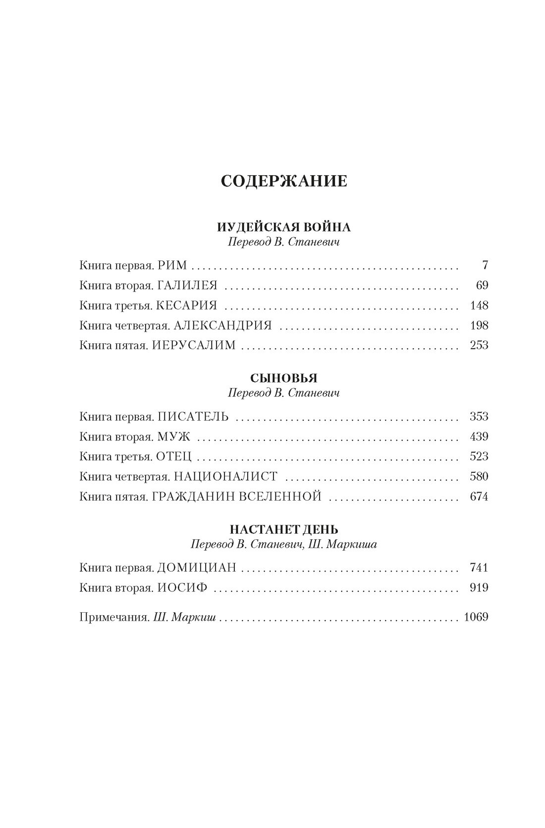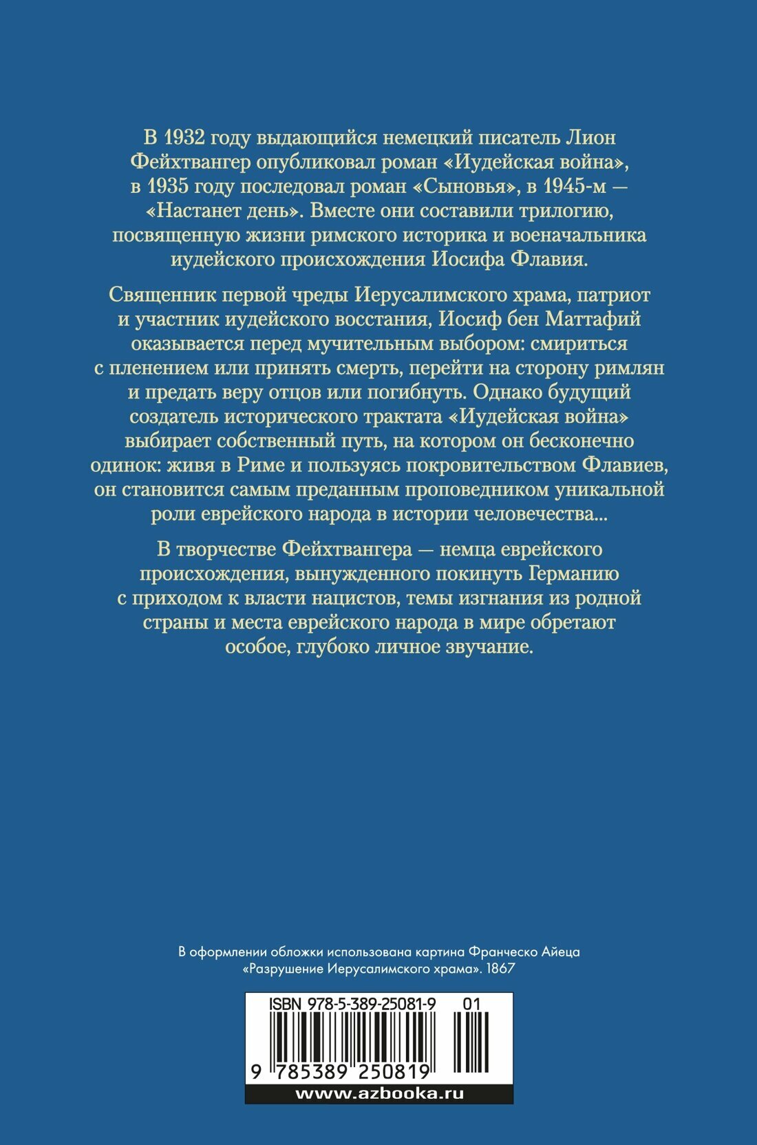 В 1932 году выдающийся немецкий писатель Лион Фейхтвангер опубликовал роман «Иудейская война», в 1935 году последовал роман «Сыновья», в 1945-м — «Настанет день». Вместе они составили трилогию, посвященную жизни римского историка и военачальника иудейского происхождения Иосифа Флавия. Священник первой чреды Иерусалимского храма, патриот и участник иудейского восстания, Иосиф бен Маттафий оказывается перед мучительным выбором: смириться с пленением или принять смерть, перейти на сторону римлян и предать веру отцов или погибнуть. Однако будущий создатель исторического трактата «Иудейская война» выбирает собственный путь, на котором он бесконечно одинок: живя в Риме и пользуясь покровительством Флавиев, он становится самым преданным проповедником уникальной роли еврейского народа в истории человечества… В творчестве Фейхтвангера — немца еврейского происхождения, вынужденного покинуть Германию с приходом к власти нацистов, темы изгнания из родной страны и места еврейского народа в мире обретают особое, глубоко личное звучание.