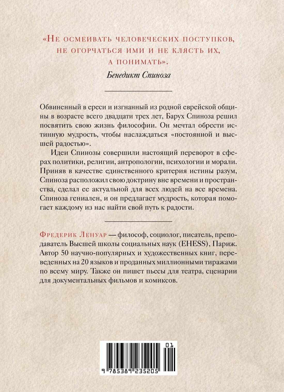 Труды Спинозы произвели революцию в области философии. В далеком XVII веке этот человек предвосхитил приход эпохи Просвещения и современную форму демократии, стал основоположником историко-критического подхода к толкованию Священного писания и заложил основы глубинной психологии. Но прежде всего Спиноза разработал философскую систему, основанную на умении верно направлять свои желания и таким образом достигать истинной радости — систему, полностью изменившую нашу концепцию Бога, морали и счастья. Во многом этот философ опередил не только свою эпоху, но и нашу с вами. Именно это и называется чудом Спинозы. Книга маститого французского автора Фредерика Ленуара предлагает тонкий, блестящий анализ мировоззрения Спинозы, отраженного в его главной работе, «Этика» (1675), и других сочинениях, исследует факты биографии, повлиявшие на формирование его философской системы, и взаимосвязи с современниками. Также в книге приводится ценная переписка автора с Робером Мисраи, одним из крупнейших современных исследователей философского наследия Спинозы.
