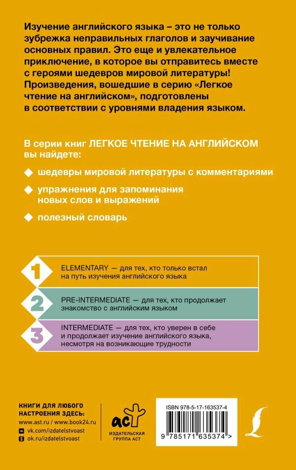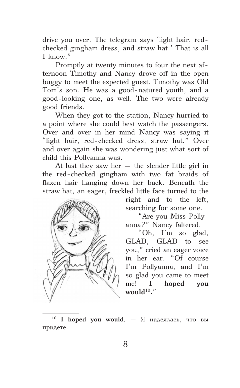 Маленькая Поллианна после смерти отца осталась сиротой и ее взяла на воспитание строгая родственница тетя Полли. Все несчастья девочка стойко переносит благодаря «игре в радость», которой когда-то научил ее отец. Поллианна не только сама видит во всем хорошее, но и учит этому других и таким образом кардинально меняет жизнь тети и всех соседей. Текст произведения снабжен комментариями к наиболее трудным словам и выражениям, а также упражнениями на проверку понимания прочитанного. В конце книги расположен словарь, который поможет лучше освоить текст. Книга предназначается для тех, кто только начинает изучение английского языка (уровень 1 — Elementary).