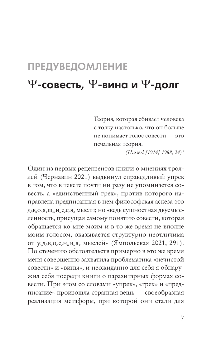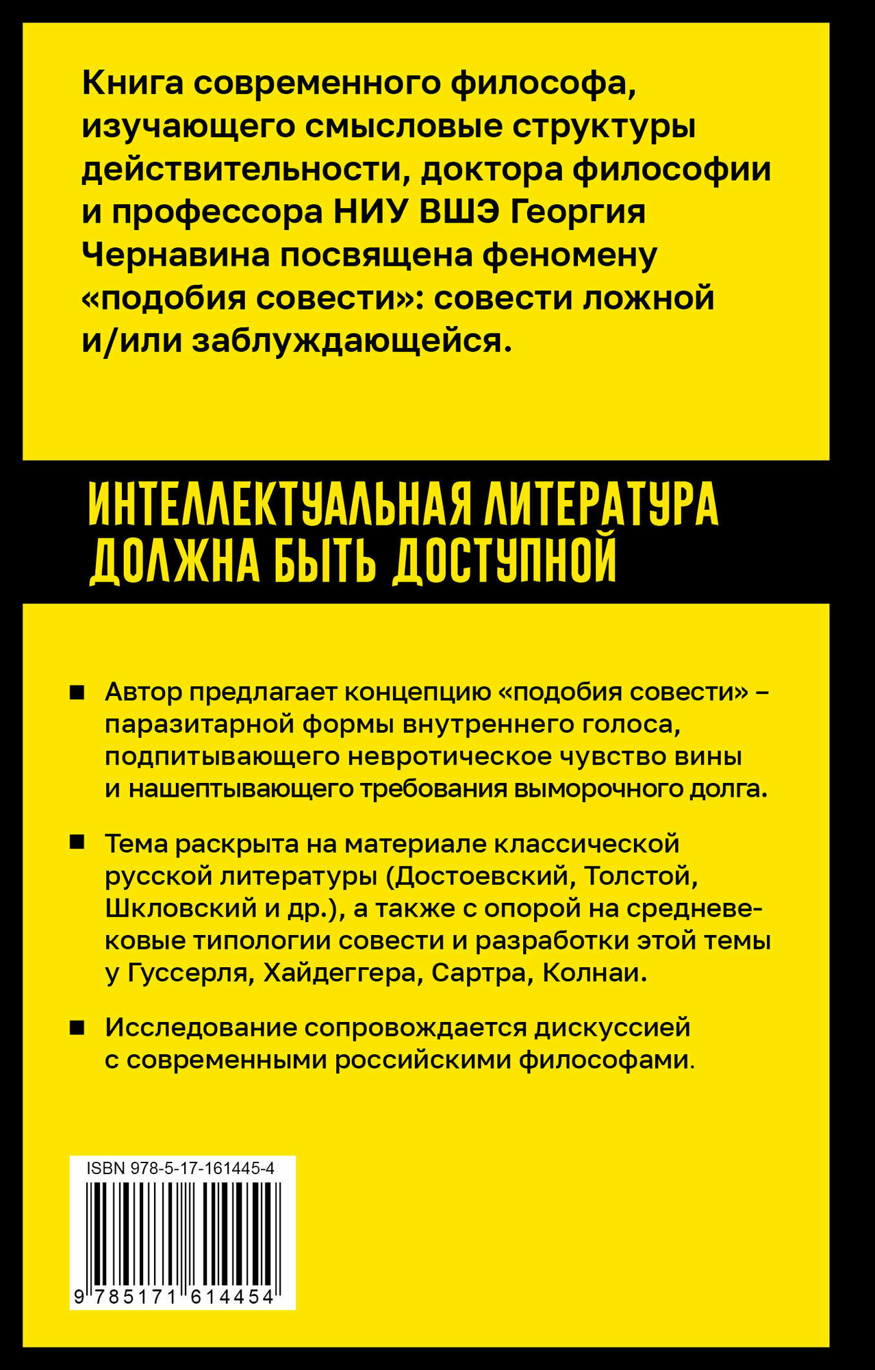 В новой книге Георгий Чернавин предлагает концепцию «подобия совести» – паразитарной формы внутреннего голоса, подпитывающего невротическое чувство вины и нашептывающего требования выморочного долга. Речь идет о псевдо-этических образованиях, выдающих себя за самое подлинное в нас, о царстве подобий и имитаций. Тема раскрыта на материале классической русской литературы, а также идеологически нагруженных текстов, привлекается инструментарий немецкой и французской феноменологии. Основные интуиции книги поданы, в том числе, в формате дискуссии с современными российскими философами.