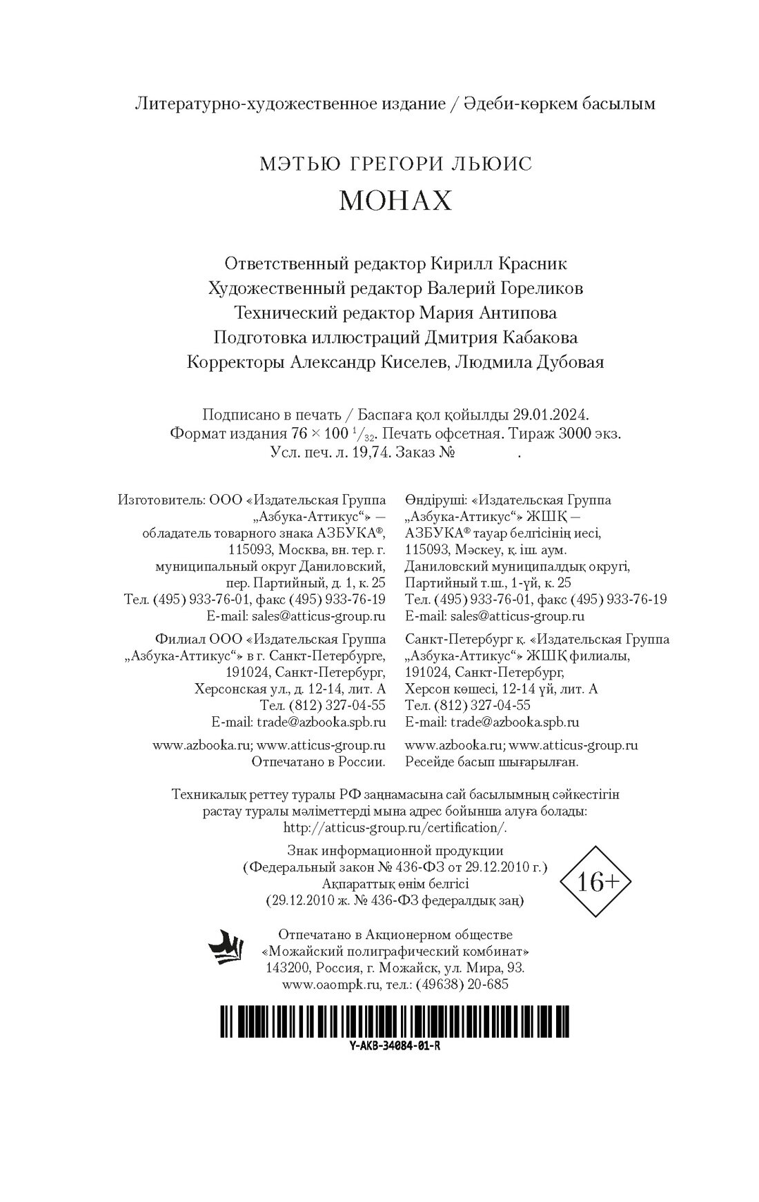 Книга: Монах (Льюис Мэтью Грегори); Азбука, 2024