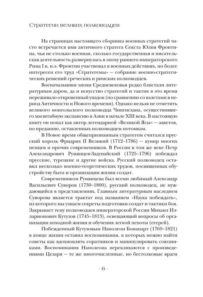 В этой книге собраны самые знаменитые военные стратегии, произнесенные или записанные великими полководцами и философами. Теоретики и практики военного дела оставили для потомков бесценные правила, позволяющие применить стратегию и тактику не только в реальном сражении, но и в бизнесе или решении конфликта. Книга поможет прикоснуться к универсальным принципам жизни и сориентироваться в сложных ситуациях современного мира. Издание будет интересно как истинным любителям военной истории, так и всем, кто хочет мыслить стратегически в повседневной жизни.