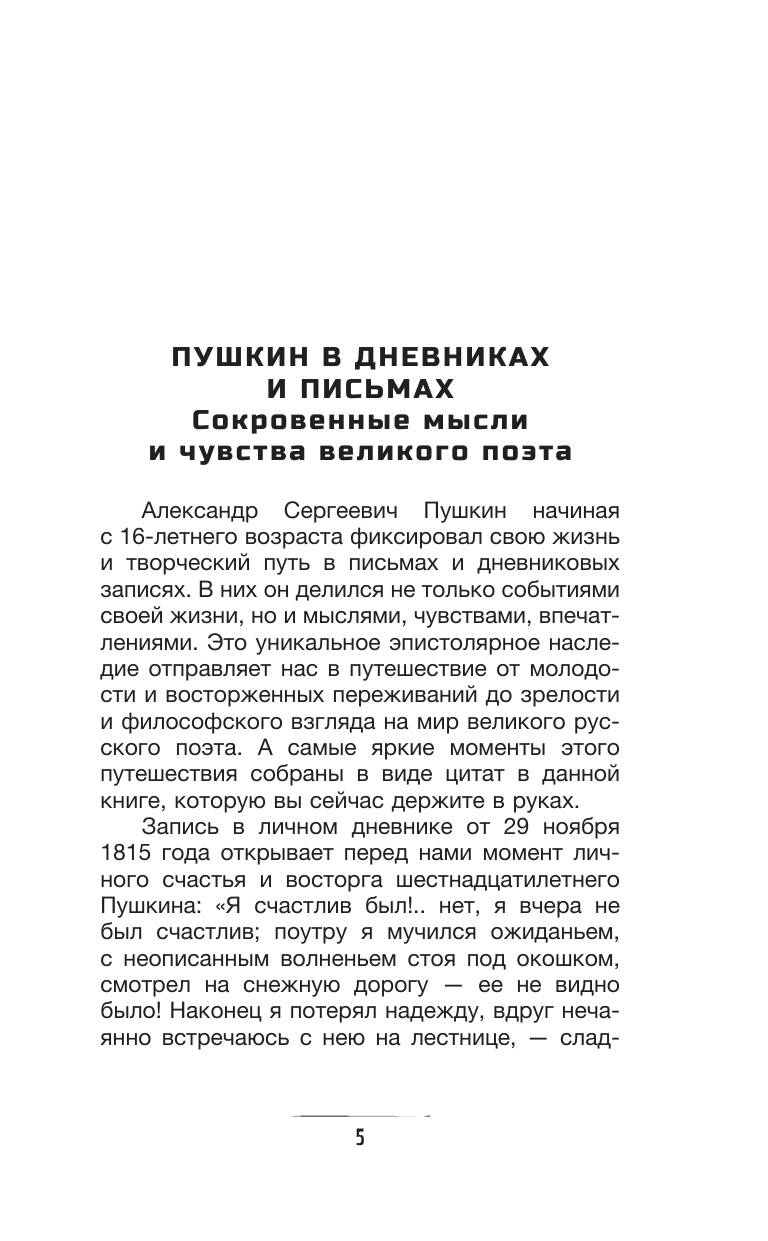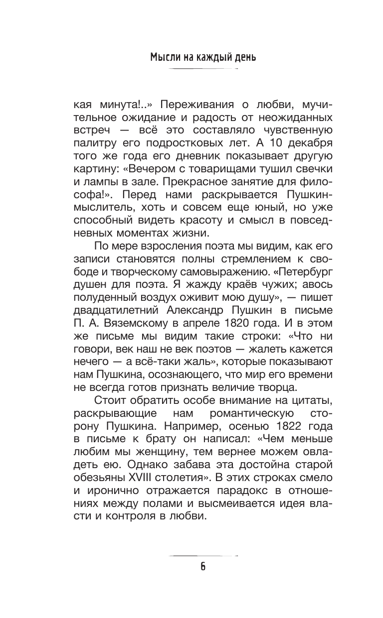 Книга «Пушкин. Мысли на каждый день» составлена из фрагментов писем, дневников, записных книжек Александра Сергеевича. В них он делится не только событиями своей жизни, но и мыслями, чувствами, впечатлениями. Эти цитаты позволяют заглянуть в мир великого поэта. Его жизнь и творчество открывают перед нами настоящее приключение. Каждая страница книги — портал в глубины души поэта, где мы можем наблюдать за его волнующими переживаниями, ощущать пульс его времени и чувствовать пламя его страсти. «Все, что было у нас до Пушкина, росло и тянулось именно к нему, к своему ещё не видному, но уже обещанному солнцу...» — писал о нем Иннокентий Анненский.