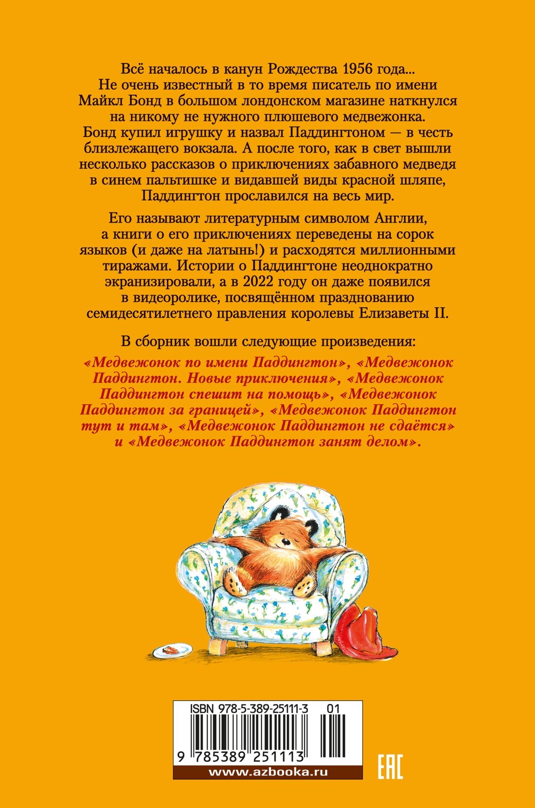 Чтобы попасть в Лондон из Дремучего Перу, нужно долго-долго плыть на корабле, а потом ещё ехать поездом. Именно так и сделал маленький медвежонок в широкополой красной шляпе. И вот в один прекрасный день он очутился на Паддингтонском вокзале. Удача улыбнулась отважному путешественнику: прямо на платформе он познакомился с мистером и миссис Браун, благодаря которым обрёл друзей, собственную комнату, синее пальтишко, а также звучное имя — Паддингтон. С того момента, как в доме Браунов поселился любознательный и очень деятельный медвежонок, там частенько происходят удивительные события. Просто такой уж этот медведь — с ним постоянно что-нибудь приключается! С тех пор как в 1958 году Майкл Бонд написал первые рассказы о медвежонке по имени Паддингтон, минуло уже больше шестидесяти лет. Время шло, но книги об очаровательном владельце синего пальтишка и видавшей виды красной шляпы совсем не утратили популярность и всё ещё продаются миллионными тиражами. Истории о Паддингтоне неоднократно экранизировали, а в 2022 году он даже появился в видеоролике, посвящённом празднованию семидесятилетнего правления королевы Елизаветы?II.