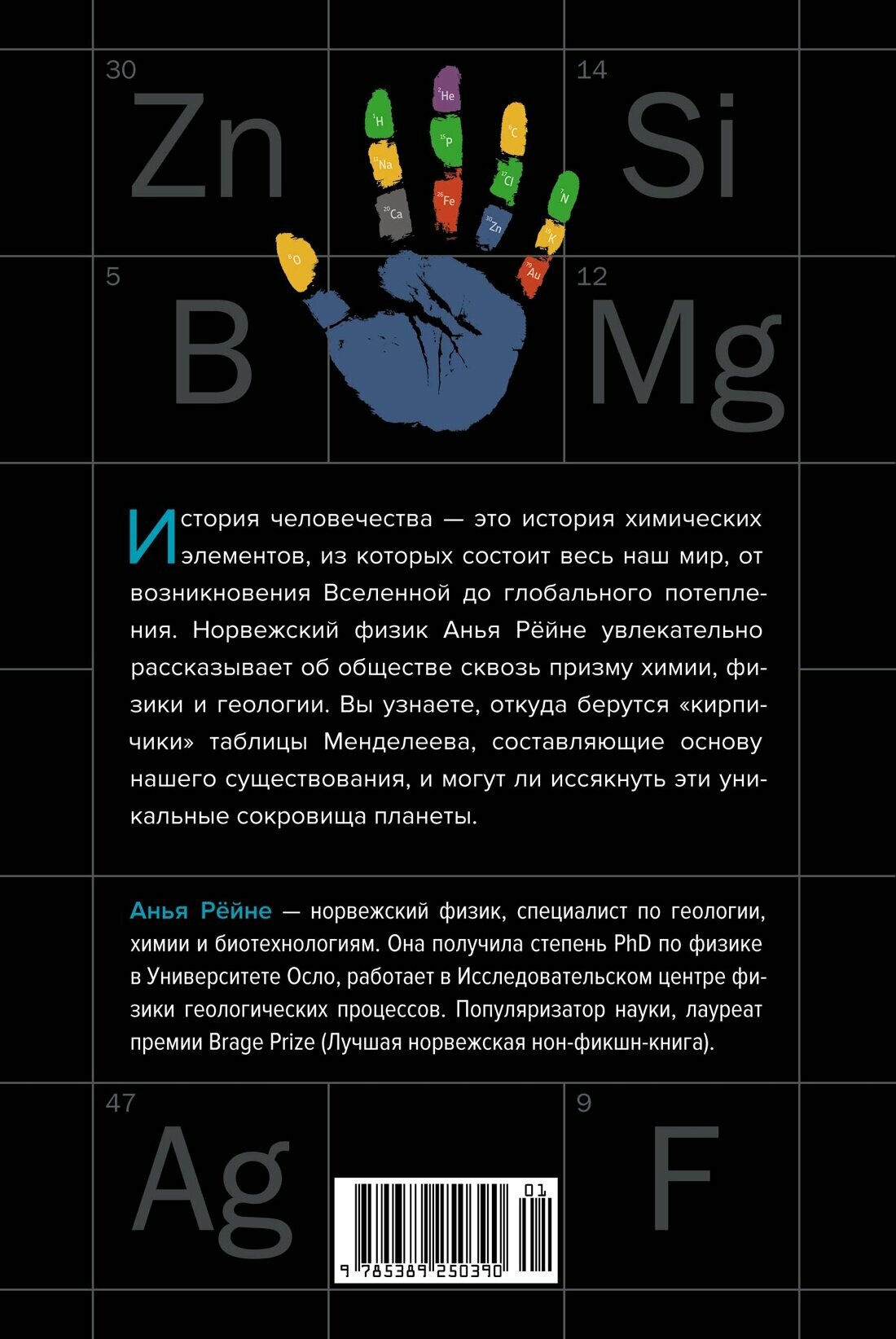 Химические элементы появились одновременно с Вселенной, они сформировали нашу планету и жизнь на ней. Однако мы редко задумываемся о том, как сильно человеческая жизнь зависит от этих невидимых героев. Норвежский физик Анья Рёйне знакомит читателей с удивительным миром материи, из которой состоим все мы. Сколько химических элементов содержится в мобильном телефоне? Почему железо необходимо для дыхания? Как связаны фосфор и ДНК? Могут ли элементы когда-нибудь закончиться, и не нанесли ли люди уже непоправимый урон планете? Из книги Рёйне вы узнаете ответы на множество вопросов и разгадаете тайны «кирпичиков» таблицы Менделеева. «Энергия, которую вы тратите на чтение этой книги, движение глаз и преобразование текста в информацию в мозге, — результат химических реакций, во время которых в клетках тела кислород и углеводы превращаются в диоксид углерода и воду» (Анья Рёйне). Ранее книга издавалась в серии «Научный интерес» под заголовком «Химия человека: Как железо помогает нам дышать, калий – видеть, и другие секреты периодической таблицы».