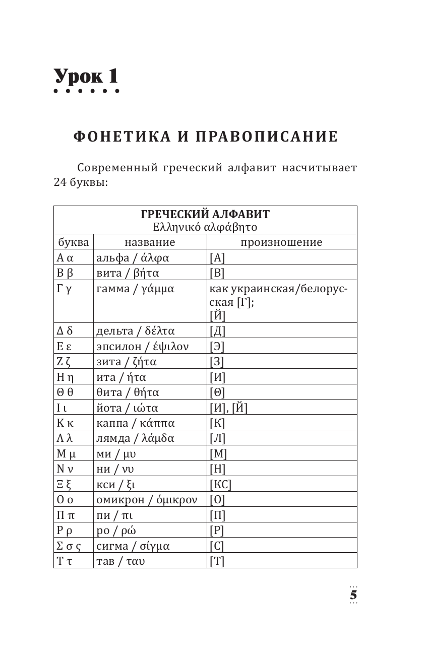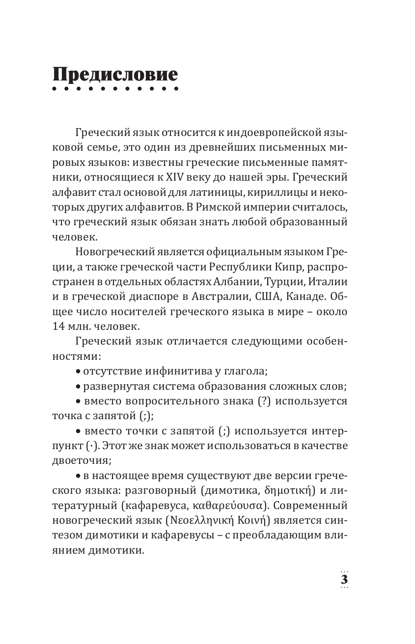 В данном самоучителе вы найдете все самое необходимое для того, чтобы освоить начальный уровень греческого языка: основы грамматики, базовую лексику, разговорные фразы, правила чтения и произношения. Грамматические темы чередуются с лексическими, что способствует развитию речевых навыков. Вы научитесь рассказывать о себе и знакомых, сможете проконсультироваться с врачом, а также обсудить любимую книгу или фильм. В каждом из 35 уроков есть упражнения для успешного закрепления пройденной темы, ответы на которые расположены в конце книги. Небольшие страноведческие вставки помогут узнать больше о культуре Греции. Материал в пособии изложен максимально понятно и доступно и сопровождается большим количеством таблиц.