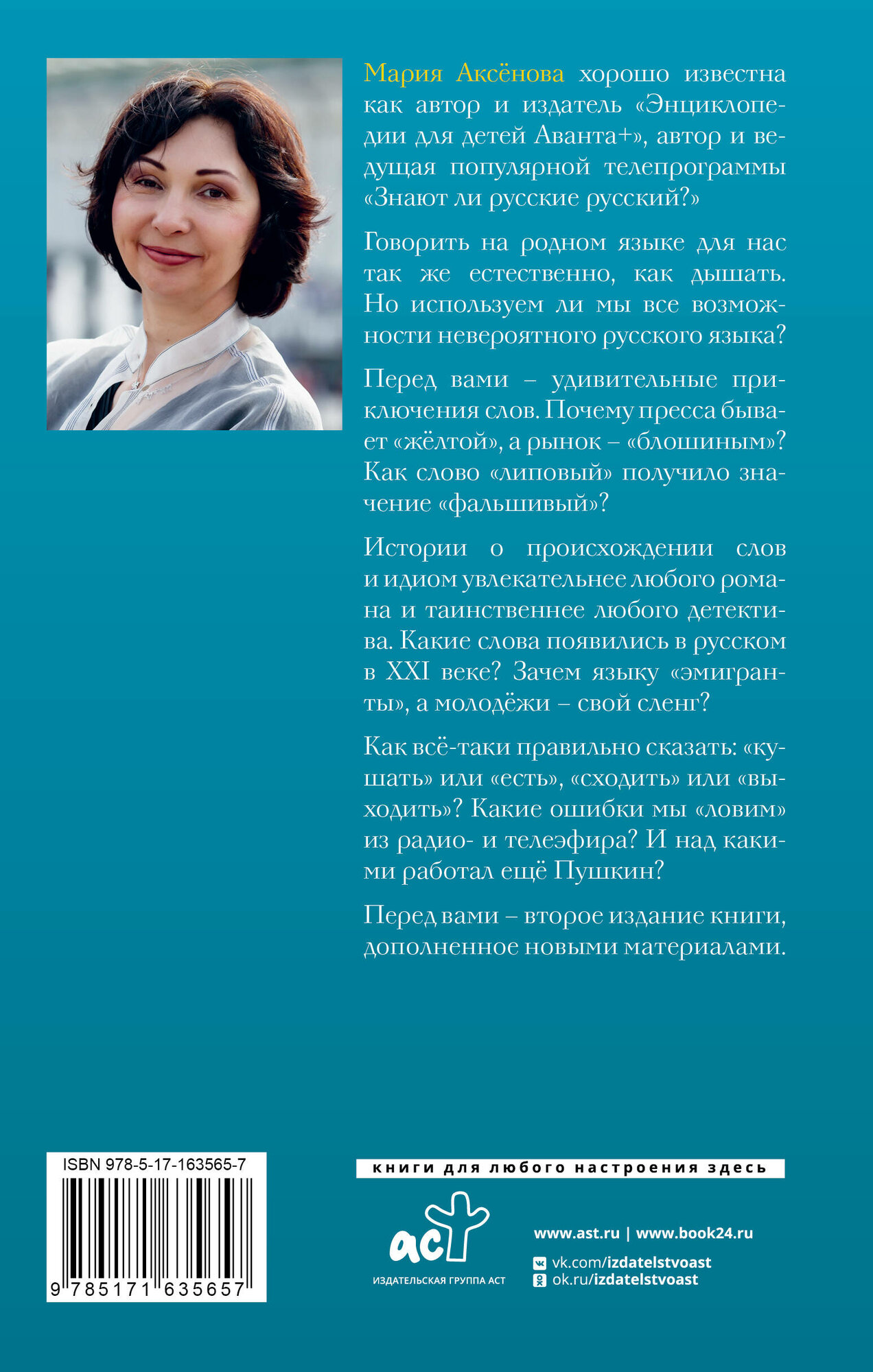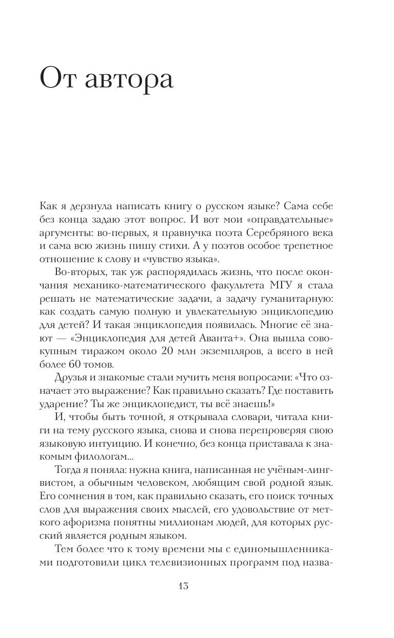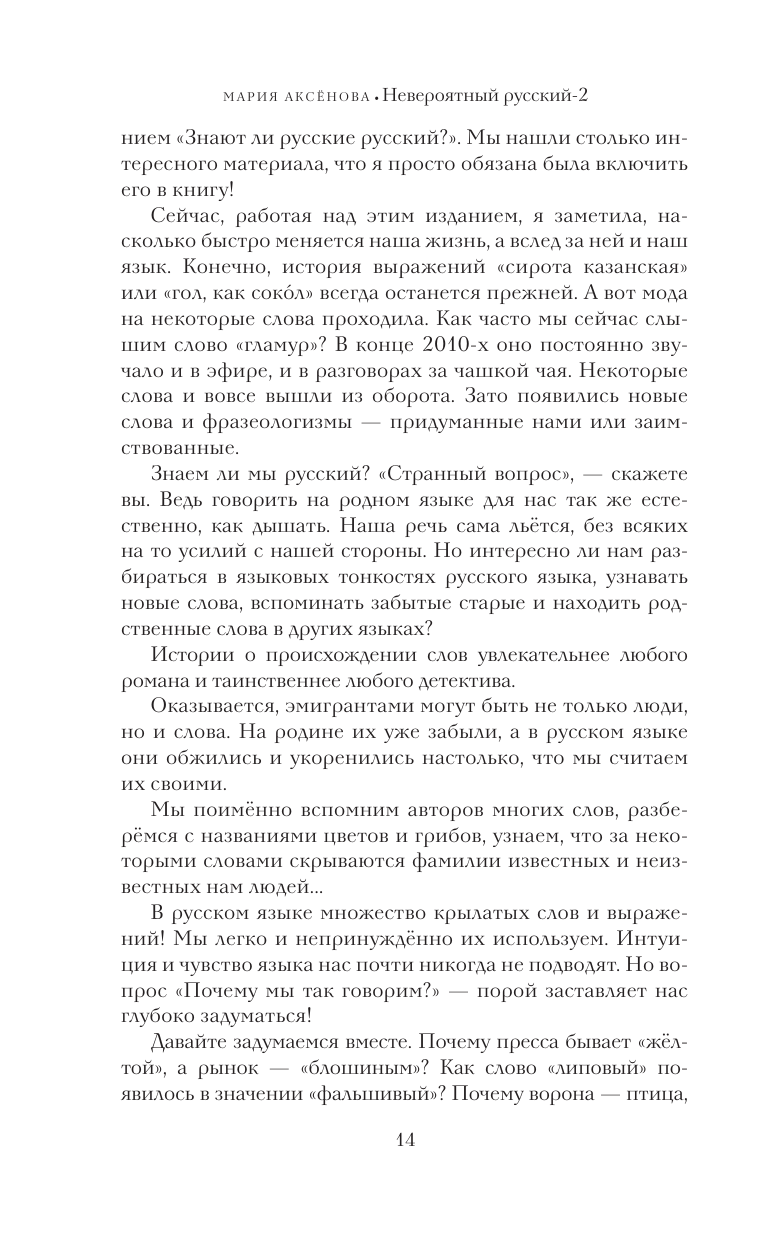 Мария Аксёнова хорошо известна как автор и издатель «Энциклопедии для детей Аванта+», автор и ведущая популярной телепрограммы «Знают ли русские русский?». Она академик РАЕН, лауреат премии Президента РФ в области образования. Говорить на родном языке для нас так же естественно, как дышать. Но насколько хорошо мы знаем русский? Истории о происхождении слов увлекательнее любого романа и таинственнее любого детектива. Перед вами — удивительные приключения слов. Почему пресса бывает «жёлтой», а рынок — «блошиным»? Как слово «липовый» появилось в значении «фальшивый»? Почему ворона — птица, которая своего уж точно не упустит, а то и чужое прихватит, — стала символом ротозейства? А молодёжный жаргон — это хорошо или плохо? «Одеть» или «надеть»? «Сходить» или «выходить»? «Кушать» или «есть»? Мы без конца поправляем и одёргиваем друг друга. А всё-таки, как правильно сказать? Какие ошибки мы «ловим» из радио- и телеэфира чаще всего? И над какими работал ещё Пушкин? Трудно безупречно говорить по-русски. Ошибки допускают самые грамотные люди. Главное — стараться их исправлять, постигать логику языка, интересоваться его историей и бесконечно наслаждаться его красотой. Перед вами — второе издание книги, с новыми материалами о невероятном русском языке.